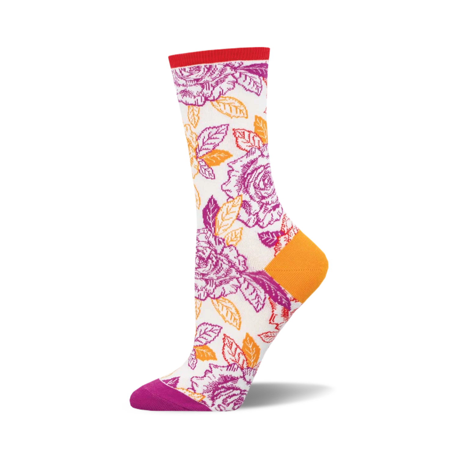 Brighten your sock drawer with a touch of sassy charm! Our Lesbian Roses novelty socks burst with a lively pattern of orange and purple roses against a crisp off-white background, punctuated by a bold red cuff and playful purple accents on the toes and heels. Perfect for festivals, casual brunches, or just lounging around, these crew-length socks add a flair of fun to any outfit. Ready to blossom in your footwear collection, why not let your feet show off their petal power?