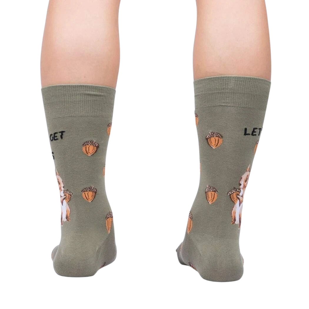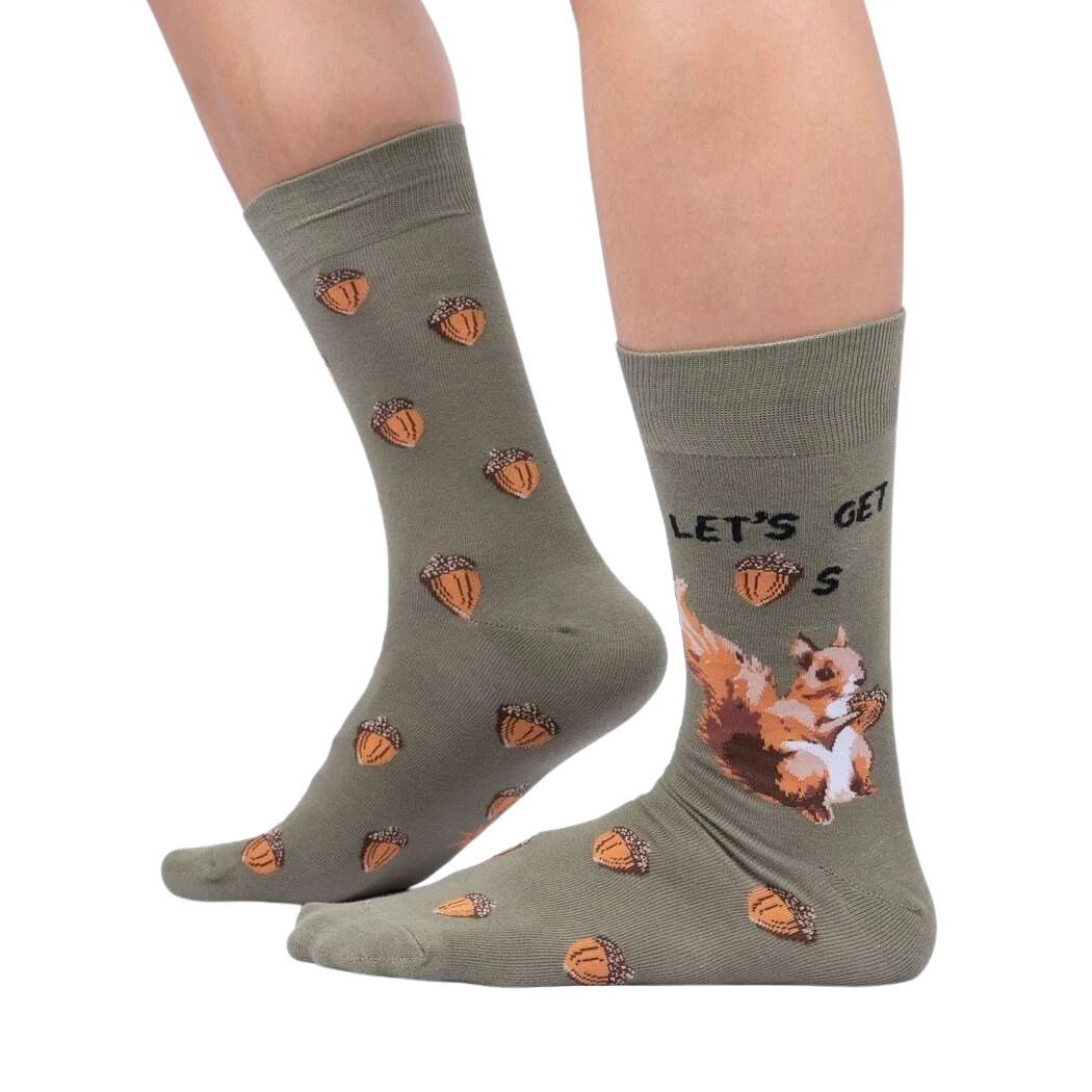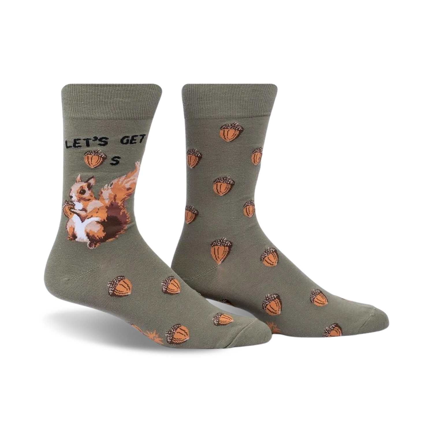 These Let’s Get Nuts socks say “I’m nuts about socks” without you having to say a word. Each pair of socks features a lively design of a squirrel holding an acorn on one sock and a pattern of acorns on the other. Perfect for people who are nuts about squirrels, trees, acorns, and dad jokes.
