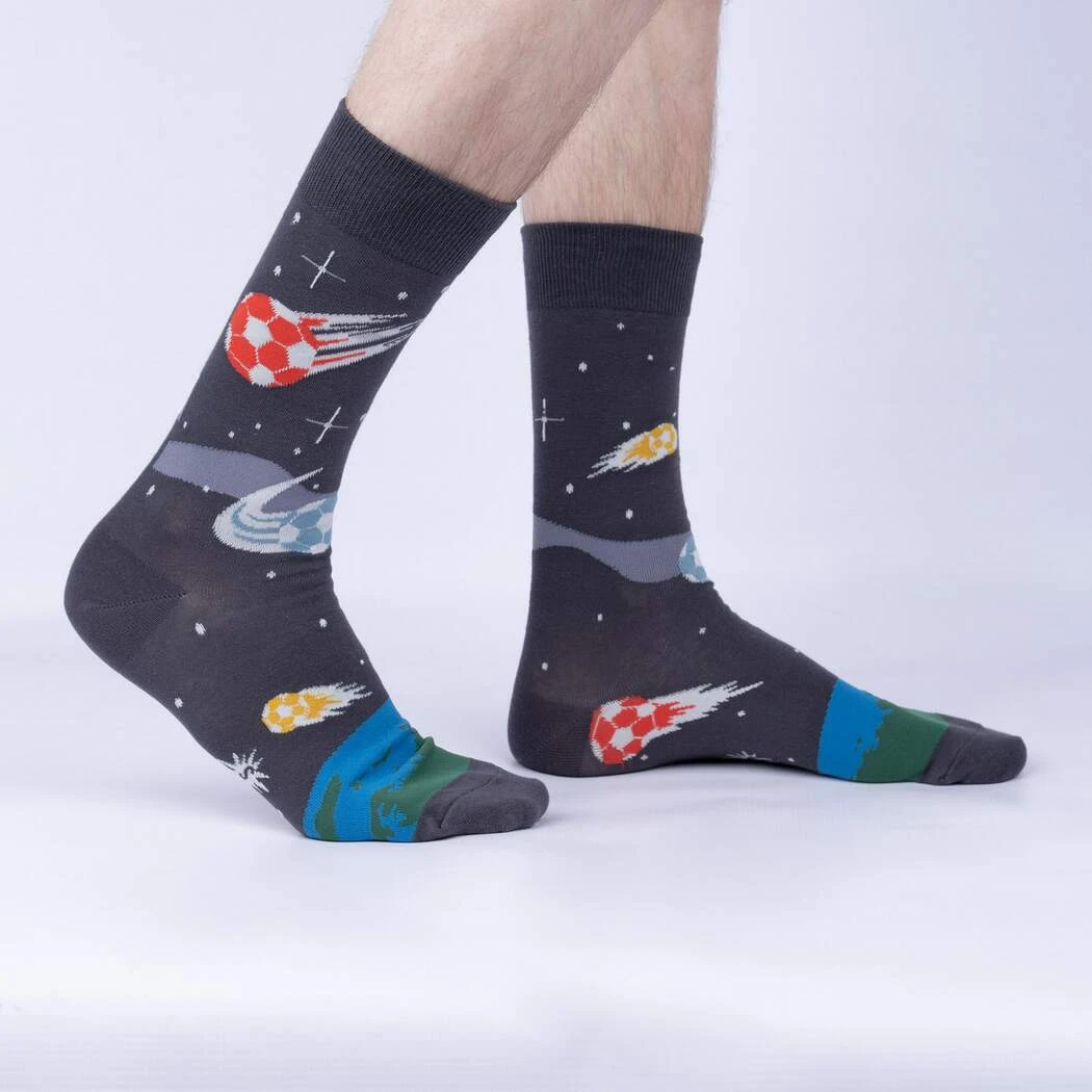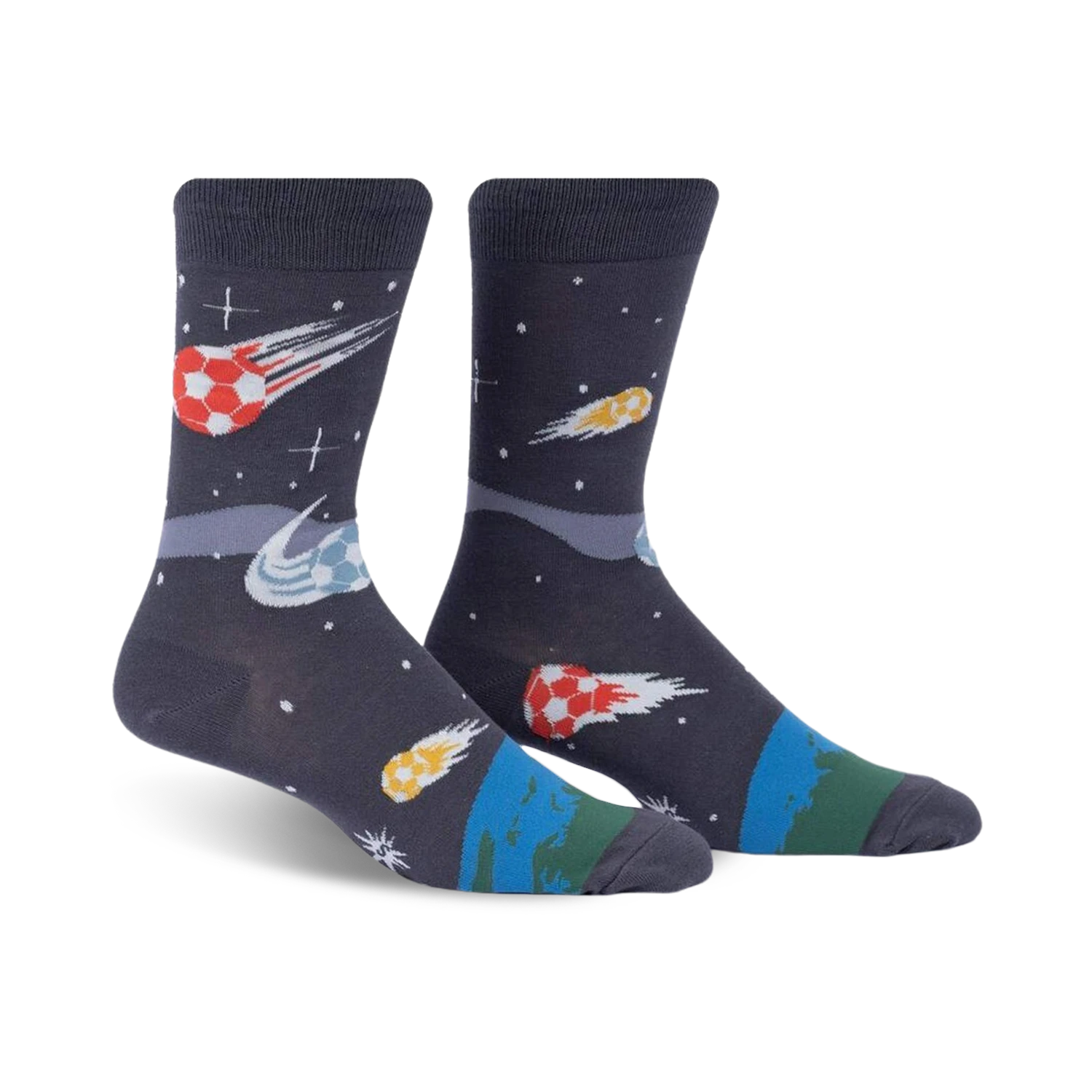 Calling all soccer fans! Our “Let’s Kick It” socks will make your next game extra fiery. Featuring a dynamic pattern of soccer balls blazing through space toward a distant planet, these socks will keep you feeling fast and focused. Plus, the durable fabric will help you tackle any challenge, so you can play your best and look good while doing it. Who says soccer can’t be a little out of this world? Get ready to score style goals with every step in these crew-length, men’s soccer socks.
