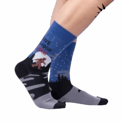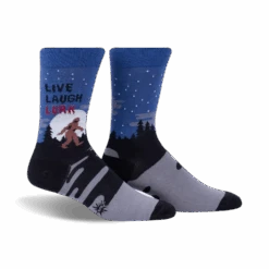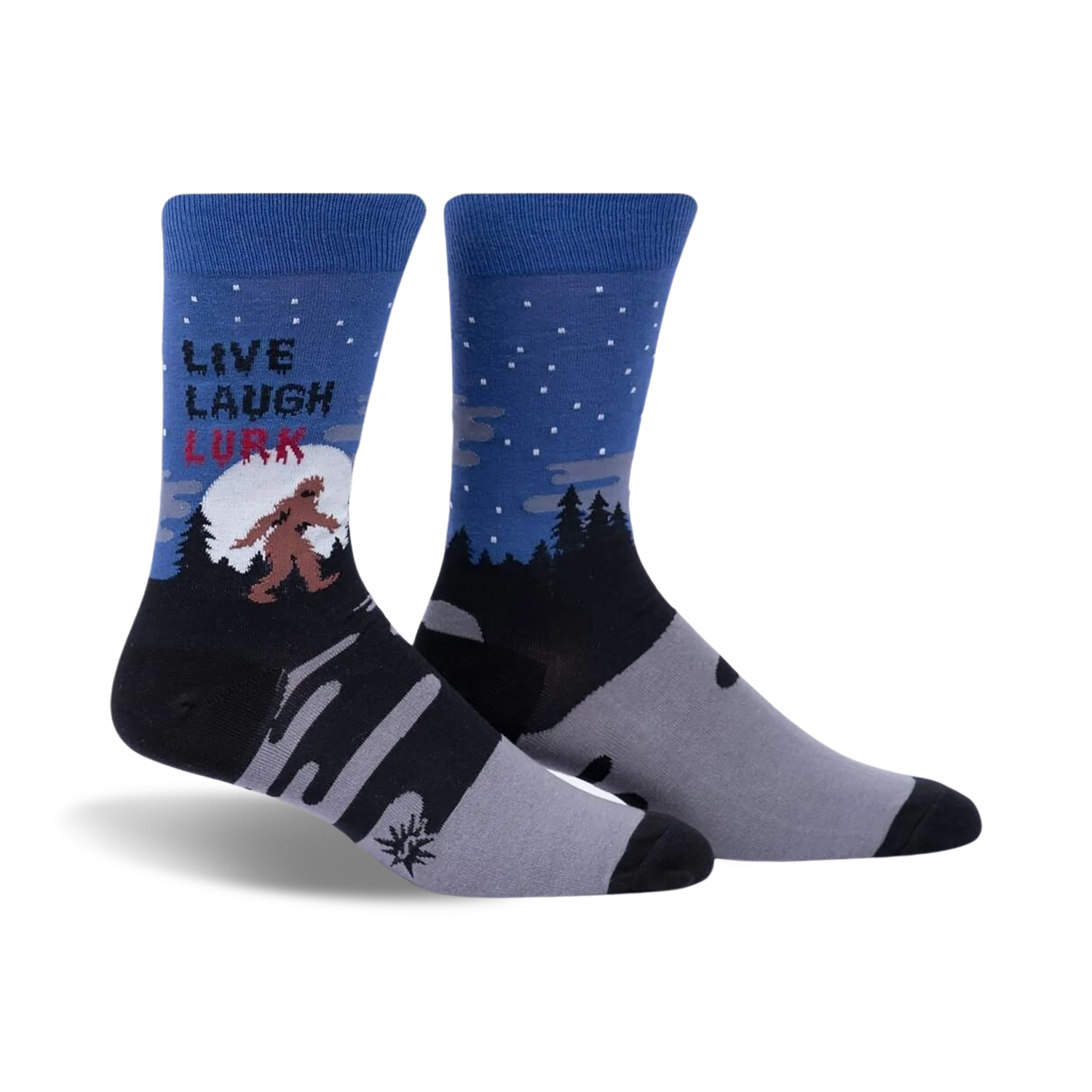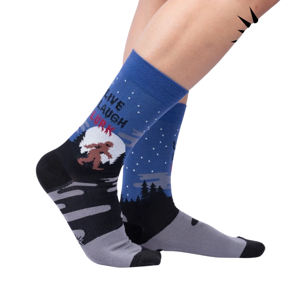 Live, Laugh, Lurk Crew Socks. Bigfoot socks with a hint of coziness. Break the ice by asking, “Do you believe in Bigfoot?” Wear these socks and go find out. Who knows, maybe he’s real and he drinks coffee just like you!