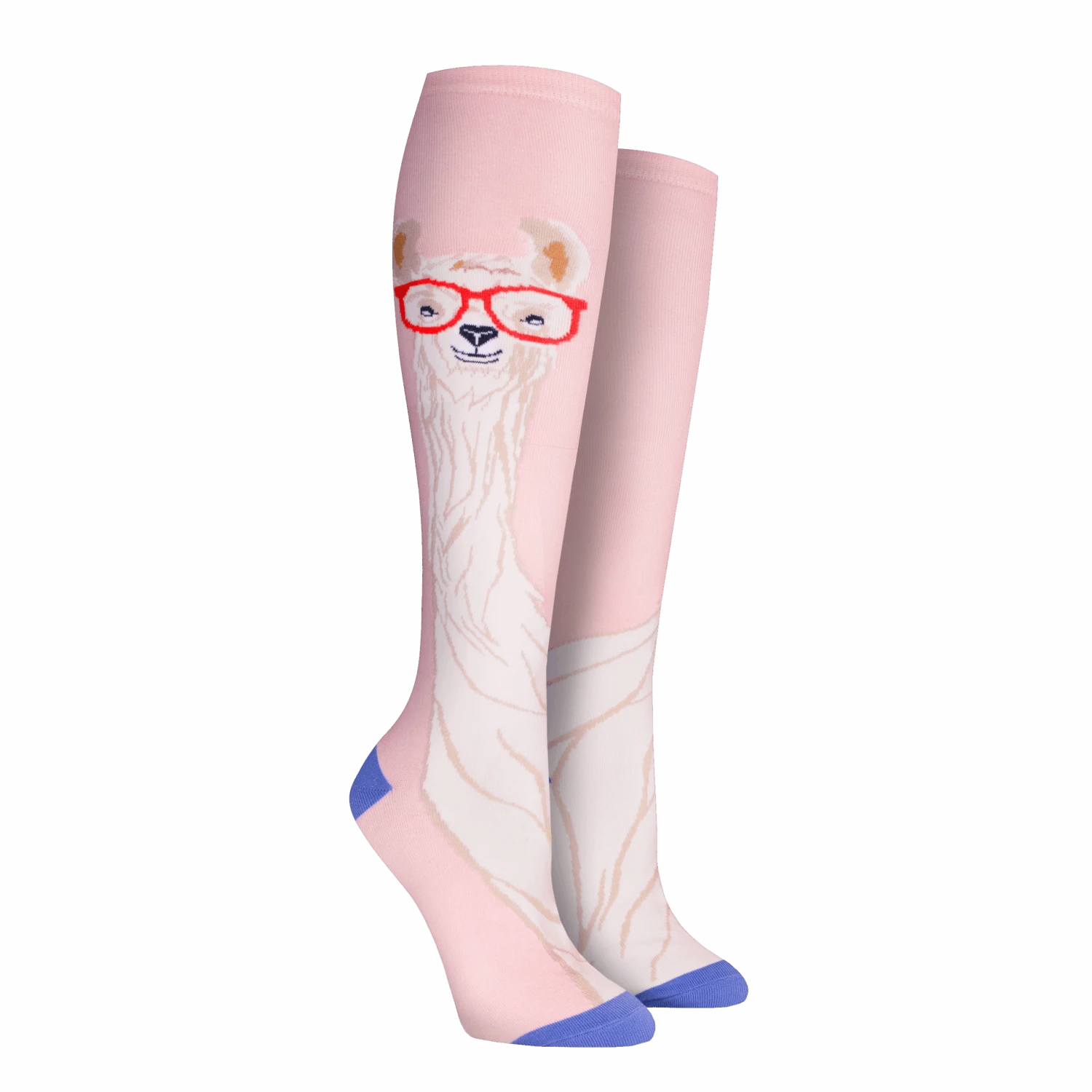 **Llama With Glasses Socks**: Brighten up your day with these knee-high cotton socks featuring a pattern of adorable brown and white llamas wearing red glasses. These fun llama socks bring a quirky touch to any outfit and make a great gift for animal lovers.