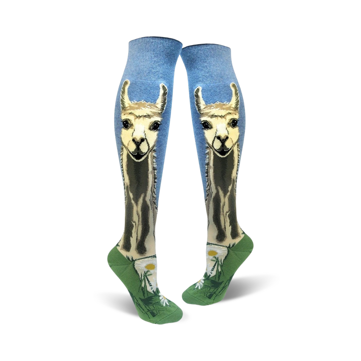 These sensational, blue, knee-high socks for women are adorned with a green toe, heel, and white flowers with yellow centers. But that’s not all these socks got! Each sock features the face of a lovely llama with a light brown face and dark brown luscious hair. Ever wonder if llamas can spit? You’ll be stepping in the right direction when you wear these cool llama socks!