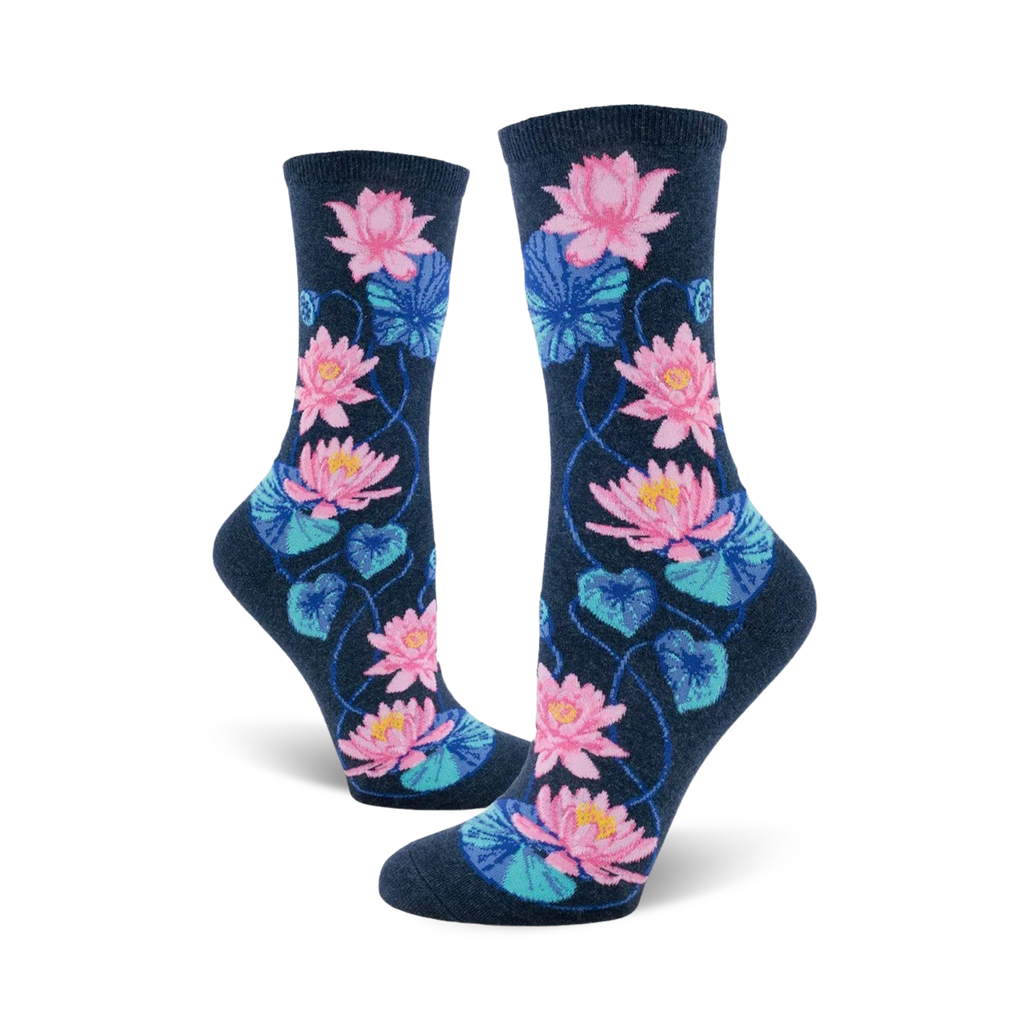 These dark blue Lotus Flower socks are blooming with funky pink and blue flowers. Each flower has a unique pattern with multiple petals. And the pointed green leaves complement the floral pattern and bring it to life!