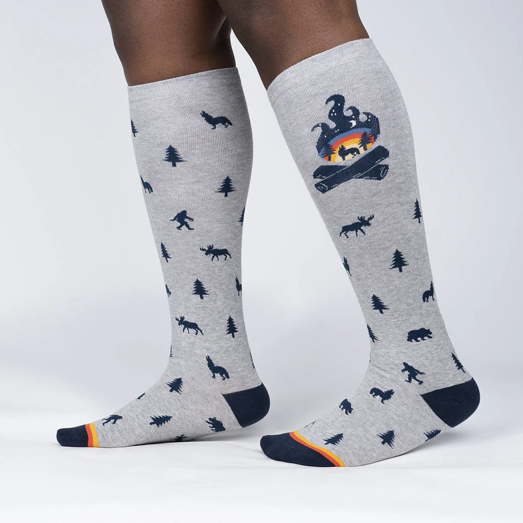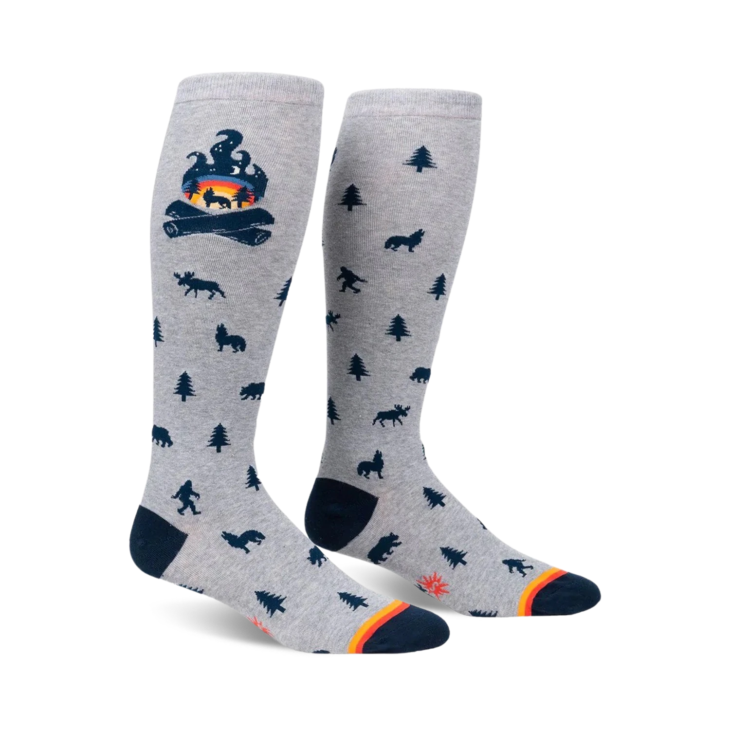 Behold, the Magic of the Forest socks, where gray trees stretch towards a golden sunset sky and silhouettes of majestic bears and wolves roam. These knee-high wonders, designed for both men and women, are more than just hosiery; they’re an adventure wrapped around your feet. Wear these and feel the mystical energy of the wilderness surge through you.