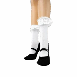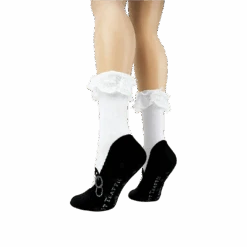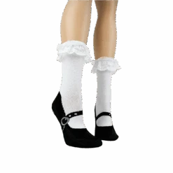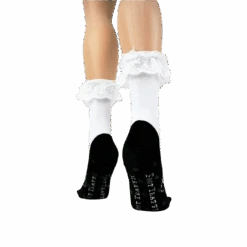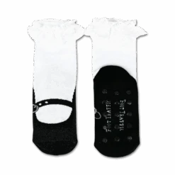 Walk in style and comfort with these Mary Jane Non-Skid Slipper socks. These white crew socks for women feature a black Mary Jane shoe print that will put a pep in your step. The lace ruffle at the top adds a touch of femininity. Show off your love for footwear with these fun and functional socks. They make a great gift for any fashionista or shoe lover in your life.