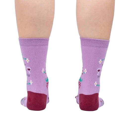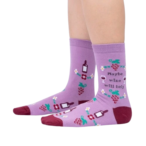 Wine not wear these purple Maybe Wine Will Help crew socks for women? The pattern of wine bottles, grapes, and flowers, along with the text “Maybe Wine Will Help” will surely make you smile. They’re the perfect pick-me-up for a long day or a fun night out. Who knows, maybe wine will help!