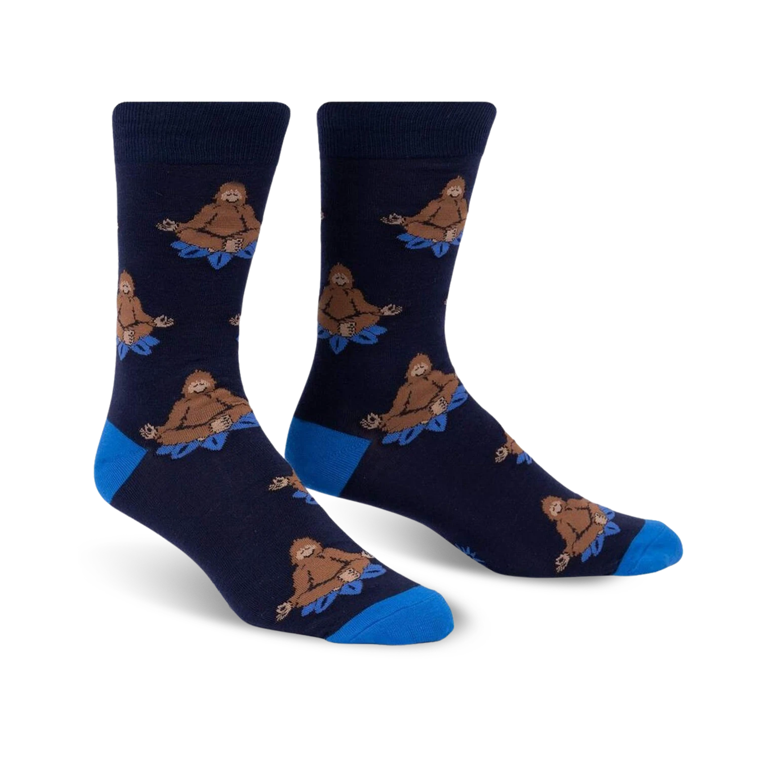 You Bet-cha Bigfoot is Meditating Socks: Calling all Bigfoot enthusiasts! Slip your feet into these cosmically comfy “Meditating Bigfoot” socks and channel your inner yeti-zen. Picture this: a dark blue background adorned with brown Bigfoots, each sporting a lotus position on a blue flower. With a blue toe and heel, these crew socks for men are perfect for finding your flow. Ideal for downward dog or just lounging on the couch with a cup of Bigfoot tea. Get your ohm on and sasquatch these socks!
