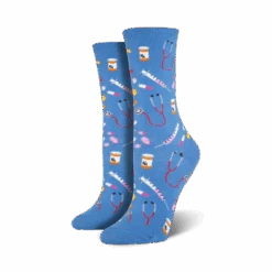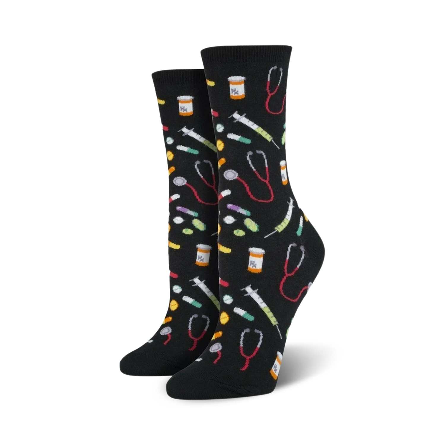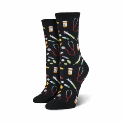 The next time you catch an episode of Grey’s Anatomy or ER, get into the spirit of things and slip on a pair of these cool women’s novelty crew socks. Each fun sock showcases different types of pills, syringes, stethoscopes, and prescription bottles printed all over against a black background. Gift these cool socks to your favorite doctor, nurse, or pharmacist!