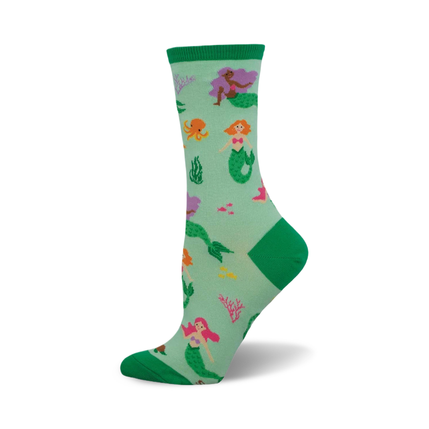 Mermaids aren’t just mythical creatures; they’re the ultimate symbol of freedom and fantasy. With “Mermaid Murmurs” socks, you can embrace a touch of that oceanic charm. These socks bring a splash of vibrant color with their enchanting mermaids, playful octopuses, and delicate coral patterns, all set against a light green backdrop. It’s the perfect way to indulge in a bit of whimsy and let your feet wander to a world where the sea meets the sky.