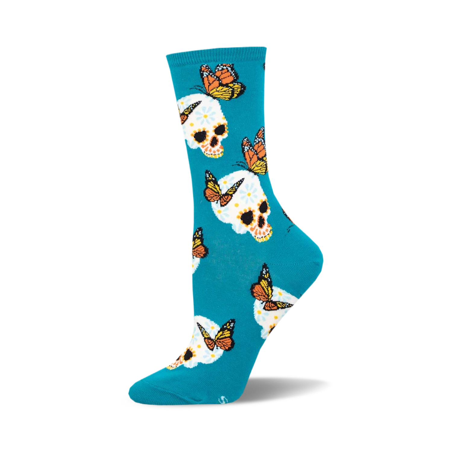 Tiptoe into the unexpected with our “Metamorphosis” crew socks. Cloaked in a deep blue, these aren’t just any foot coverings. They’re a clash of the macabre and the magnificent, where skulls whisper secrets among vibrant blooms and monarch butterflies flutter in defiance of the mundane. It’s not just about keeping your toes warm—it’s about making a statement that’s as bold as it is beautiful. Perfect for those who wear their quirks on their sleeves, or in this case, on their feet. Dive feet first into a world where every step is a story.