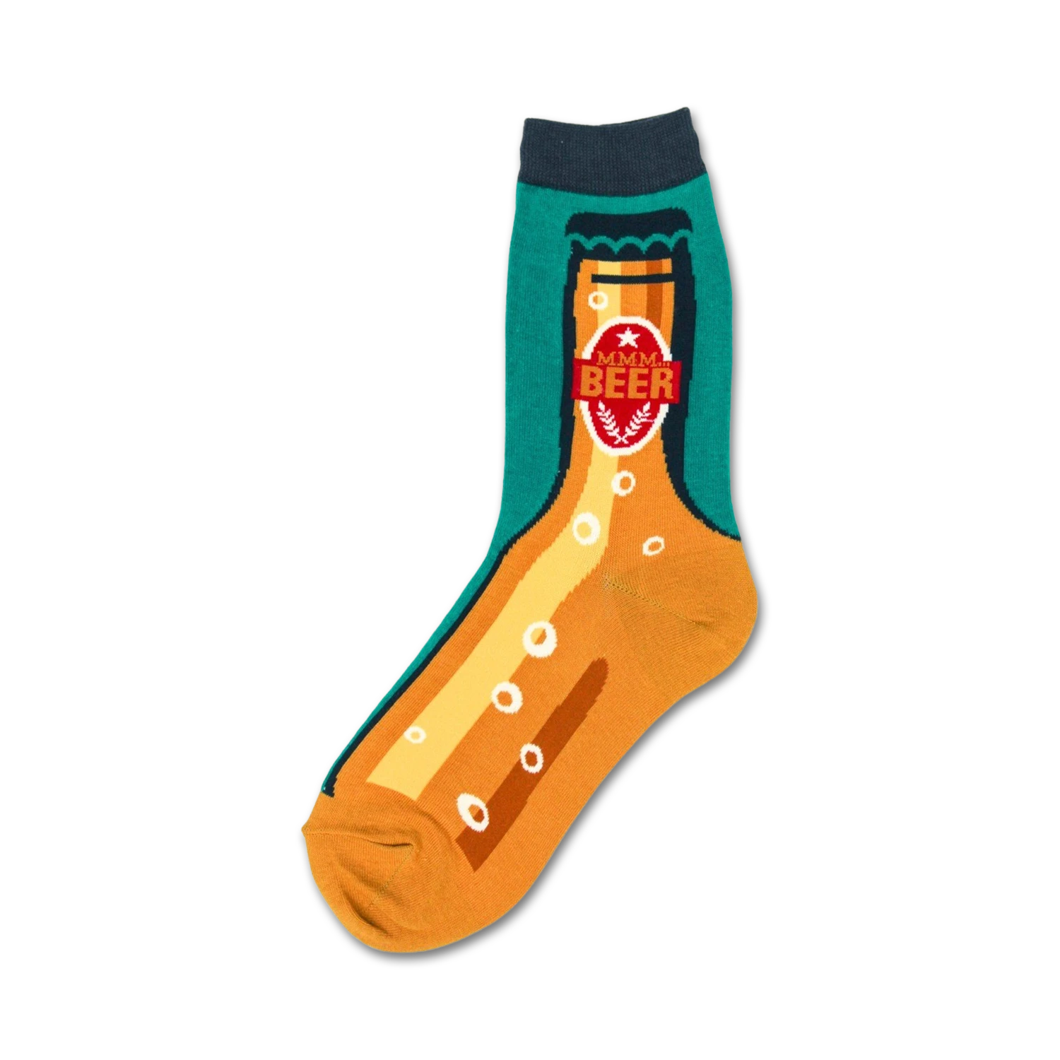Sip, sip, hooray for beer socks! The Mmm Beer socks are a refreshing take on footwear, featuring a pattern of beer bottles with witty text on a green and yellow background. With a dark green cuff and brown toe and heel, these crew socks are the perfect pint-sized accessory for any beer lover. Raise a glass and celebrate your love for hops with these thirst-quenching socks!