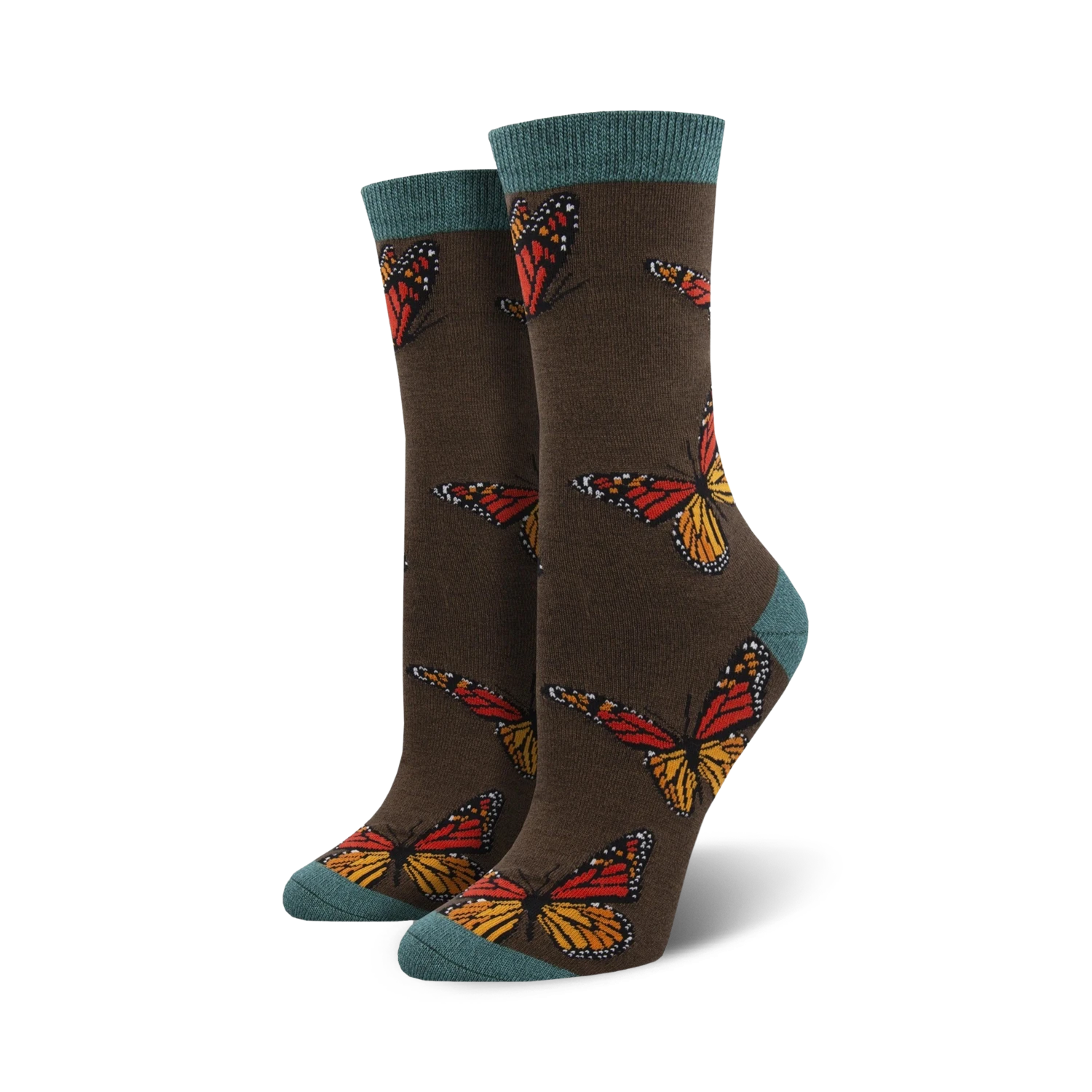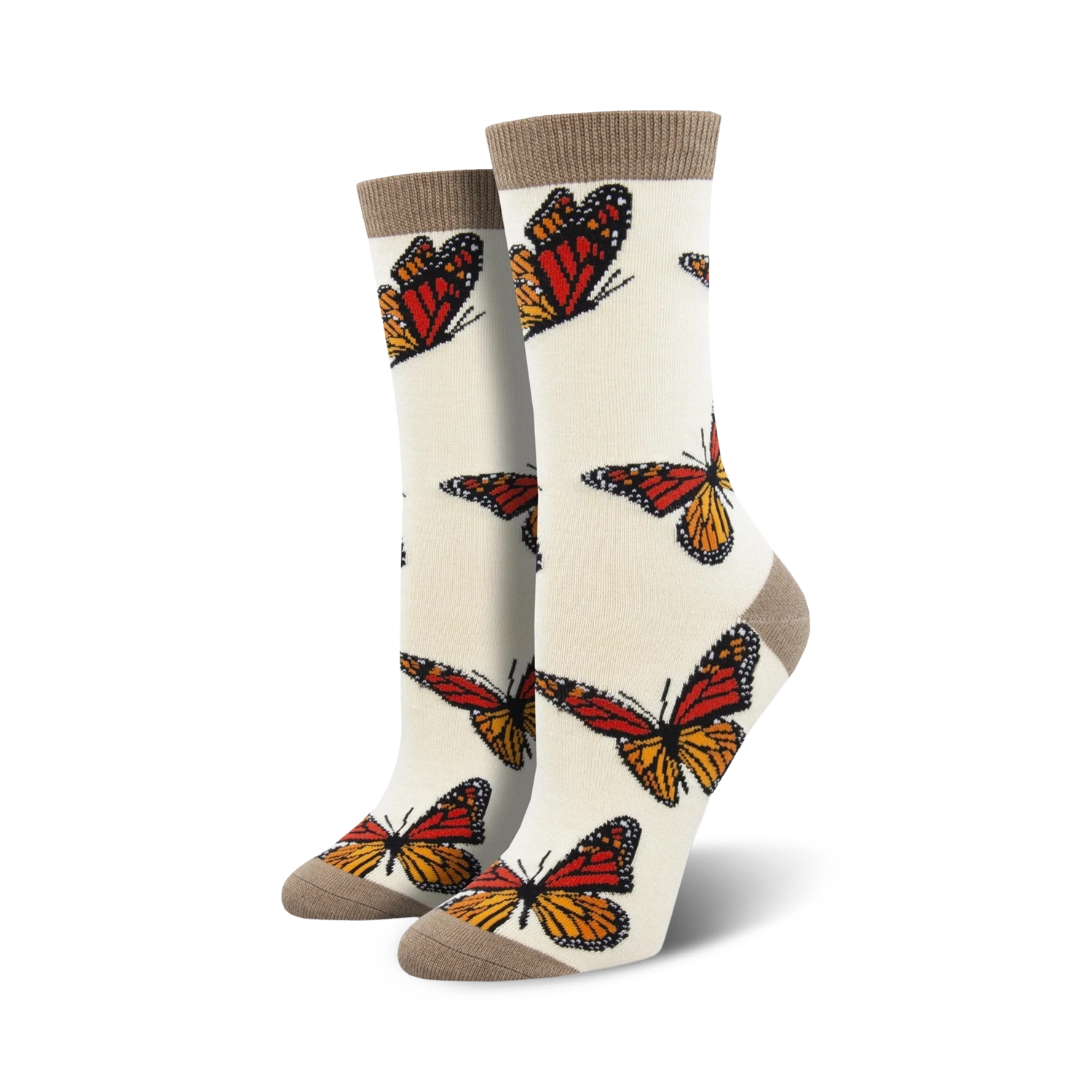 Fly with the Monarchy! These crew socks for women feature a whimsical parade of orange and black butterflies highlighted by white markings. Delicate and stunning, these socks are a fluttery fashion statement that will brighten your day. Fun fact: butterflies can taste with their feet.
