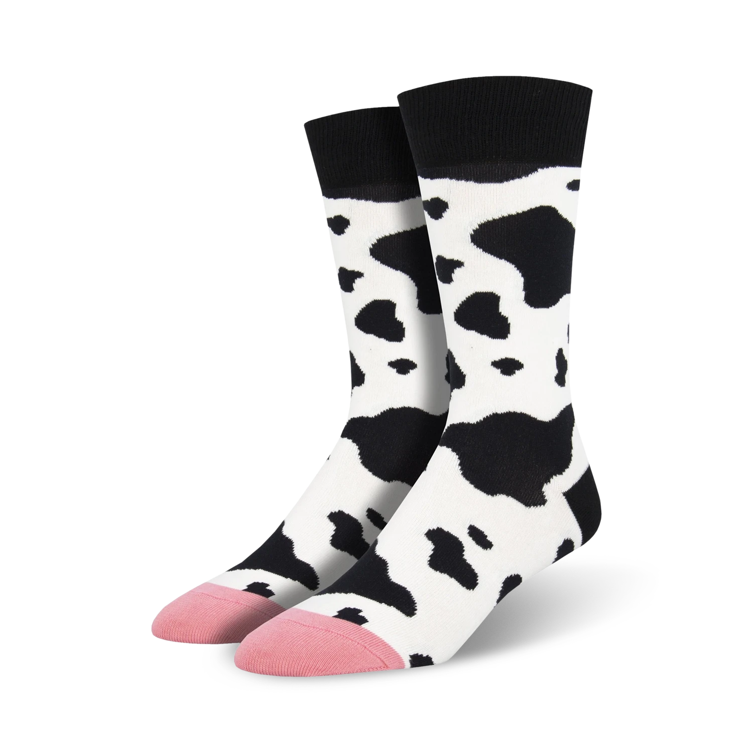 Moooo! If you’re looking for a fun and playful addition to your sock drawer, look no further than these black and white cow print socks. The sock’s pink heels and toes will add an extra pop of fun to your outfit. It’s time to udder-ly show off your bovine style!
