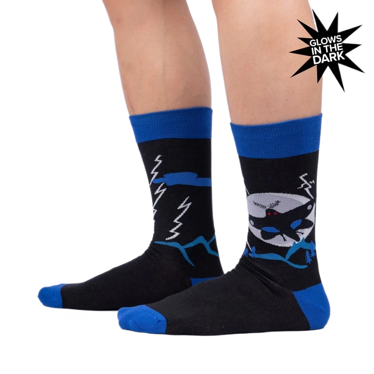 Some say Mothman roams the West Virginia skies, but today hes bringing his legendary charm right to your feet! These delightful black socks, adorned with a striking graphic of a bat soaring in front of a moonlit backdrop of mountains and lightning, make Mothman your personal cheerleader. Who knew the paranormal could be so supportive and stylish?