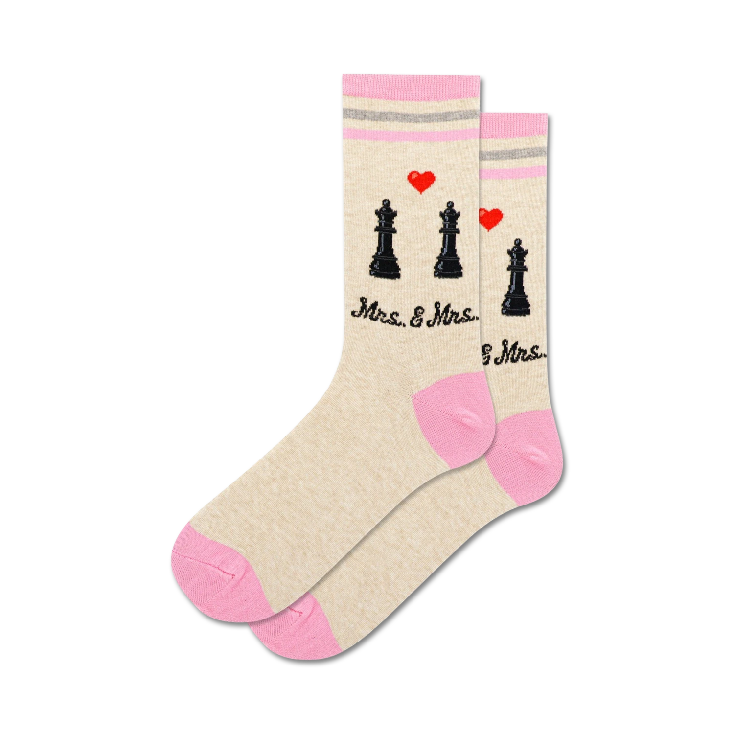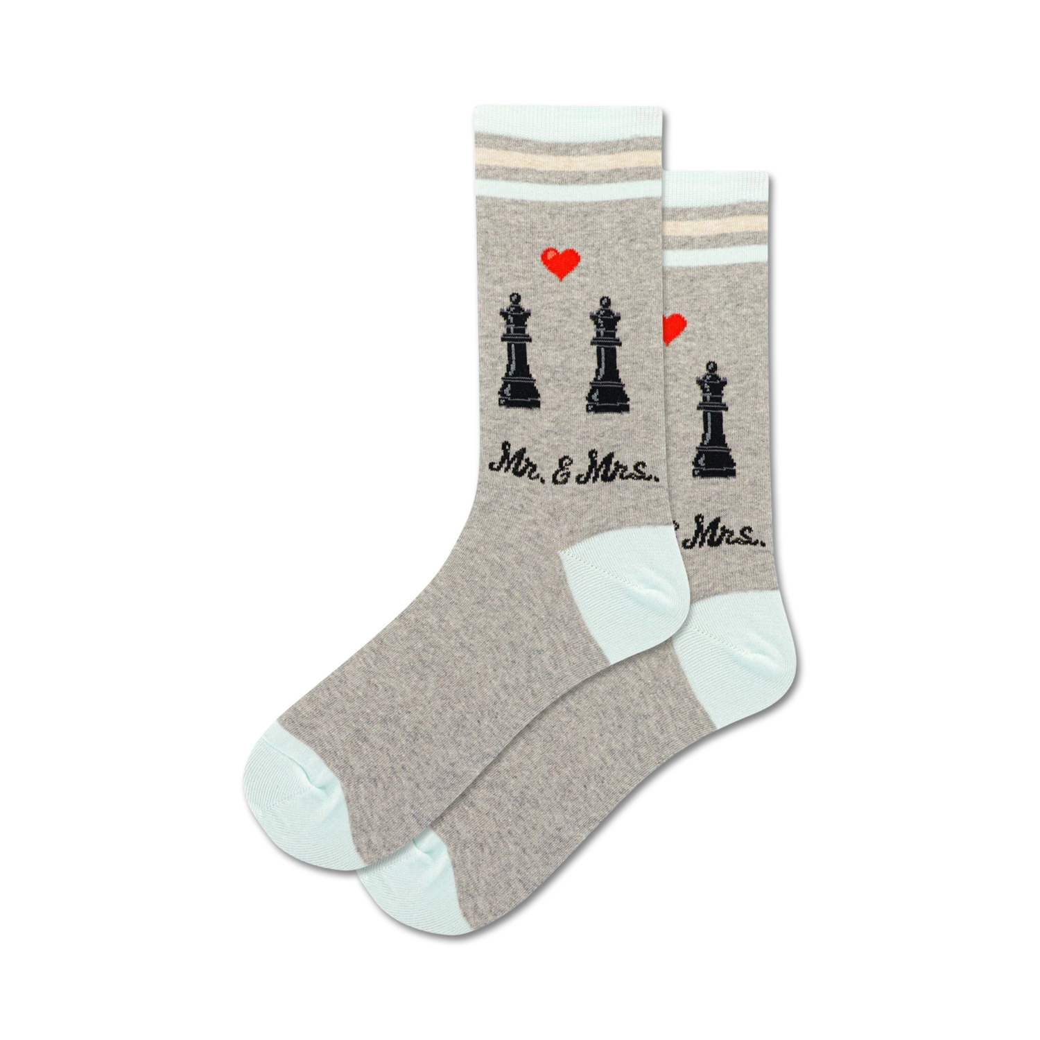 Sure, here is a fun and lighthearted description for novelty socks: “Mr. & Mrs. Checkmate: A Royal Pairing in Socks These gray crew socks are perfect for the newly crowned couple. With a king and queen chess piece pattern, these socks feature a red heart above each royal head. Whether you’re walking down the aisle or just adding some fun to your everyday style, these socks are sure to make you feel like a winner. They’re also a great gift for any chess enthusiast or newlywed couple. Fun Fact: Did you know that the queen is the most powerful piece in chess? She can move in any direction, as many spaces as she wants. The king, on the other hand, can only move one square in any direction. But don’t worry, Mr. King, you still get a heart above your head on these socks!”