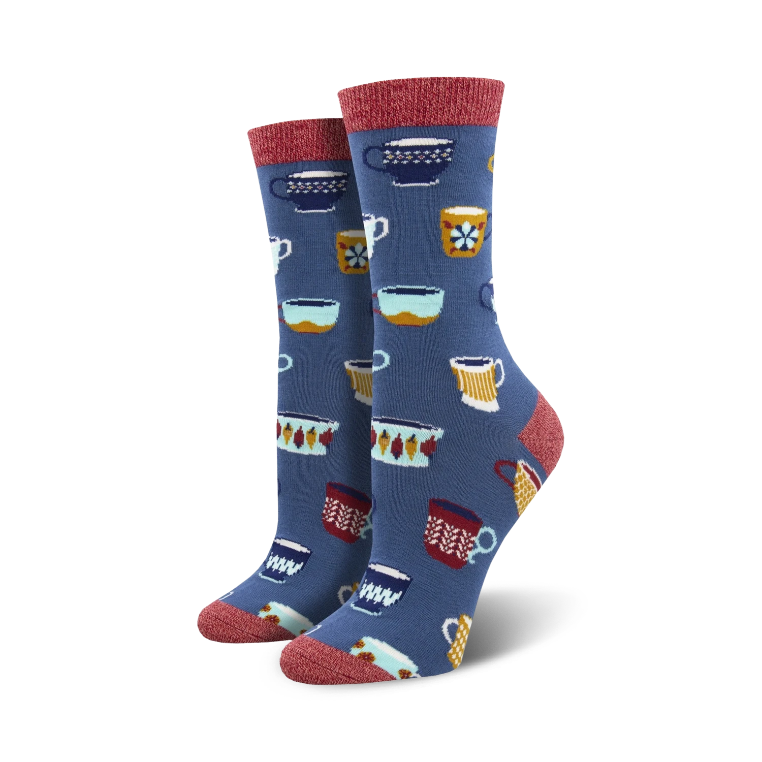 Blue bamboo socks with a fun pattern of coffee mugs. Sip your morning pick-me-up in style with these socks! They’ll add a touch of whimsy to your everyday attire. Perfect for coffee lovers and tea drinkers alike!