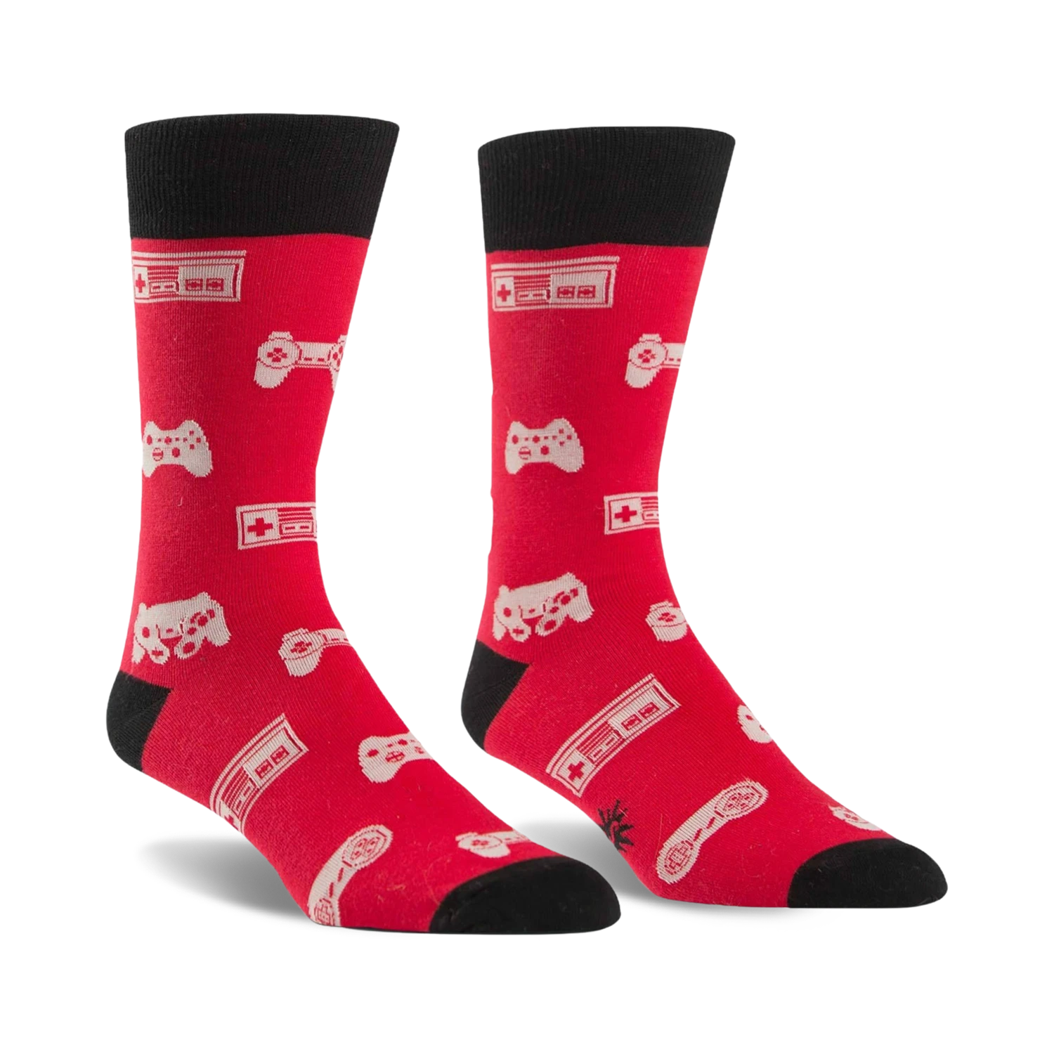 Gamer Gift Alert! ðŸ•¹ï¸ These Multi Player Crew Socks are ready to level up your sock game with their vibrant red color, black toe, heel, and cuff, and a playful pattern of video game controllers and consoles. Celebrate your passion for video games with every step and become the MVP of sock fashion.