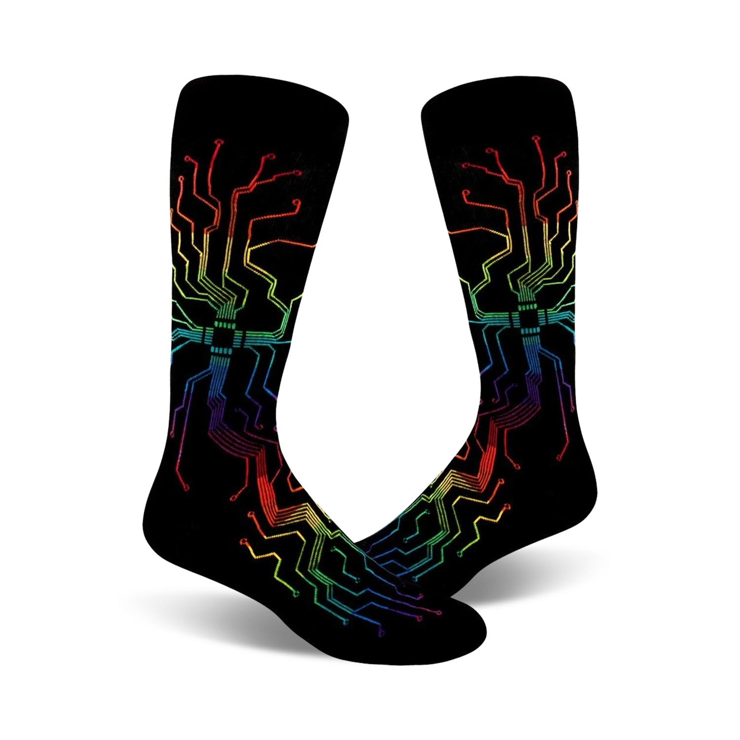 Grab a pair of Muthaboard Crew Socks and step into the future! These dazzling black socks feature a vibrant pattern of circuit boards enhanced with rainbow-colored lines. Let your feet do the talking as you show off your love for technology and embrace your inner geek. These socks are not just a fashion statement; they’re a conversation starter. Who said tech couldn’t be stylish? Get ready to make a statement with every step you take in these electrifying socks.