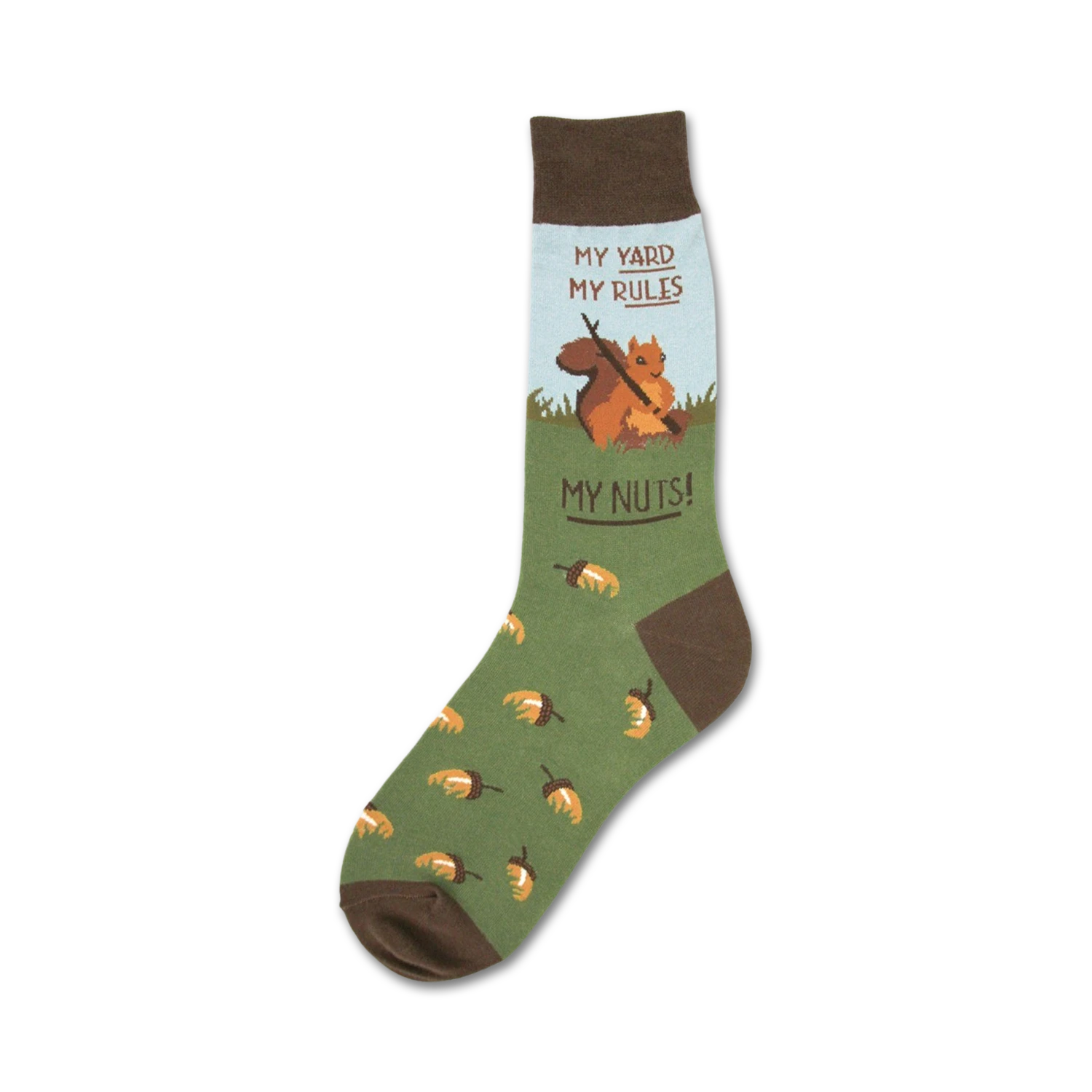 My Yard My Rules My Nuts! Socks: Step into a world of backyard hilarity with our My Yard My Rules My Nuts! socks. Featuring a squirrel standing tall on a branch, these socks boldly declares “My Yard, My Rules, My Nuts!” with a mischievous grin. With brown toes, heels, and cuffs, these green socks are scattered with acorns, completing the nutty theme. Whether you’re a proud homeowner or just enjoy a good pun, these socks will keep you smiling all day long.