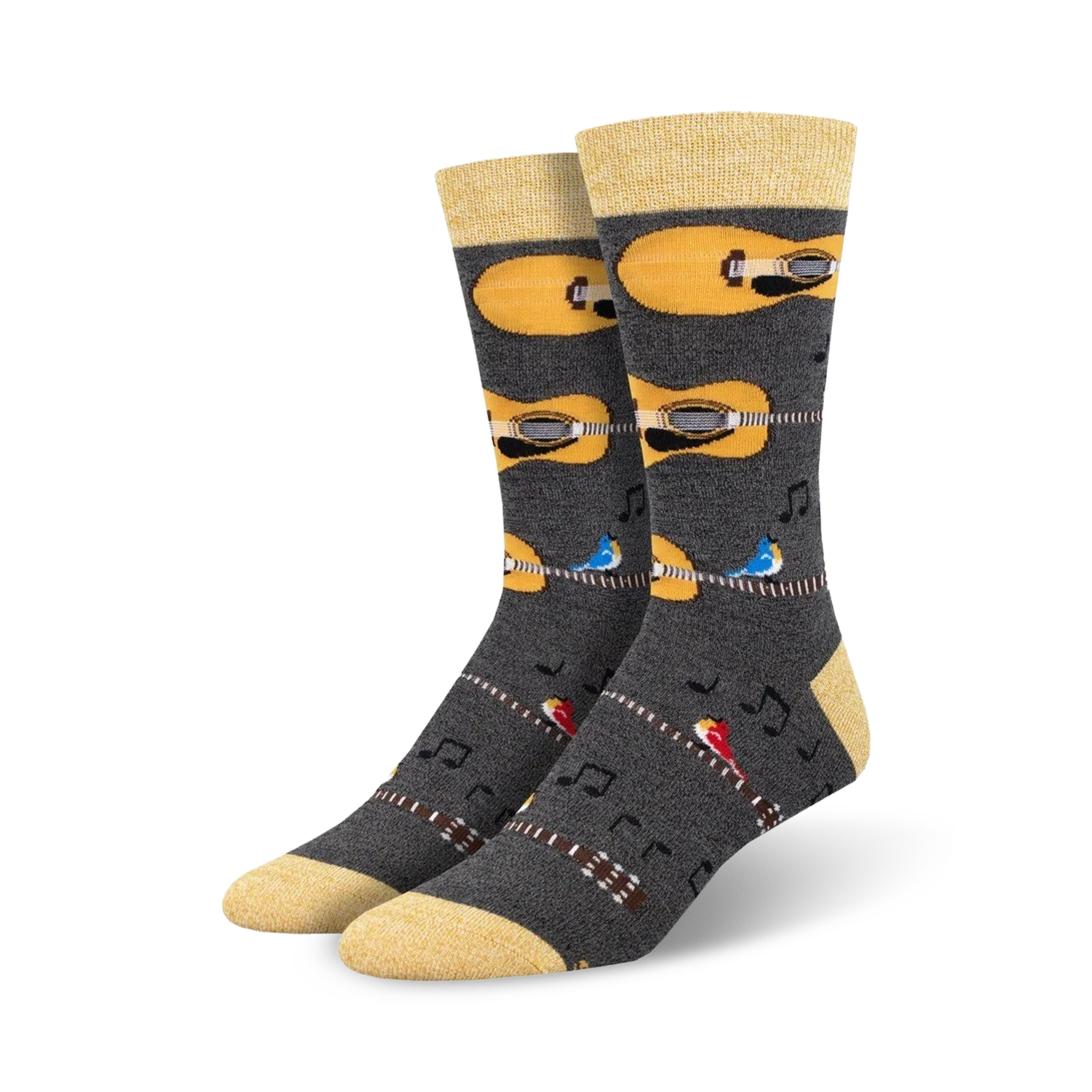 Like a rock concert for your feet, these Nice Acoustics Bamboo socks set the stage for a sock-tacular performance! Picture this: a crew of brown guitars, blue birds, and musical notes, all grooving on your feet in perfect harmony. The yellow top adds a touch of sunshine to your step, while the gray background keeps things grounded. Whether you’re hitting the open mic or just rocking out in your living room, these socks will have you feeling like a total guitar hero. They’re the perfect way to add some fun and personality to your everyday look. Fun fact: Did you know that Jimi Hendrix played guitar left-handed? So if you’re a lefty, these socks are practically made for you!