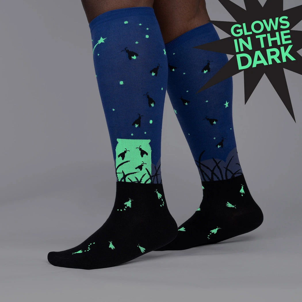 Ever get sleepy and wish you could just curl up in the grass and stare at the stars? Now you can with these Knee High Wide Calf black toe and blue top socks. The blue section features a peaceful scene with a house in a field, surrounded by glowing fireflies. The title of these cute socks is Nightlight. They come in men’s and women’s sizes.