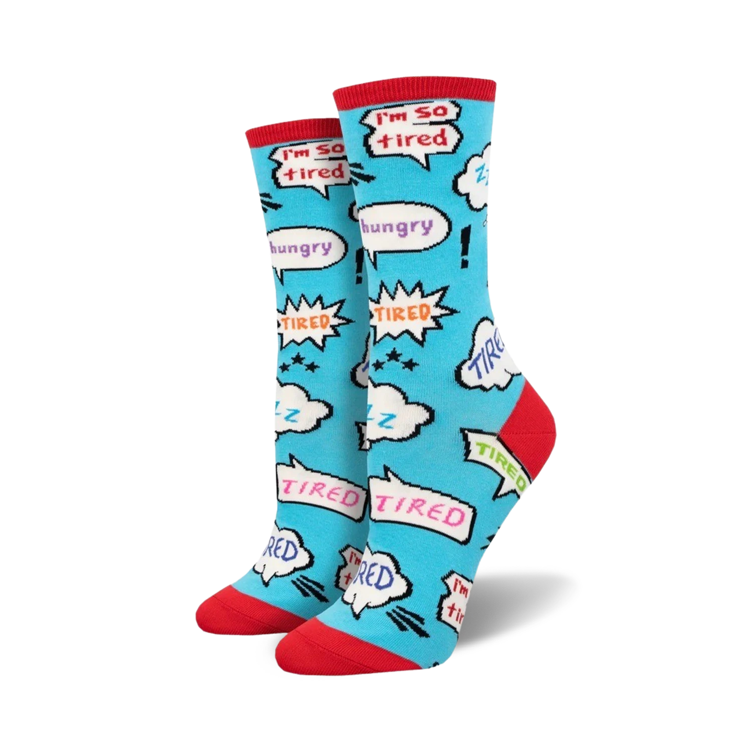 So you’re feeling a little tired and grumpy? No Rest For The Wicked socks can totally relate! With their bright blue background, colorful speech bubbles that say “I’m so tired,” “hungry,” “tired,” and “zzz,” and a red toe and heel, these socks will let the world know how you’re really feeling – without you having to say a word. These funny, comfy crew socks are perfect for women, and they’re sure to bring a smile to your face, even on your grumpiest days.