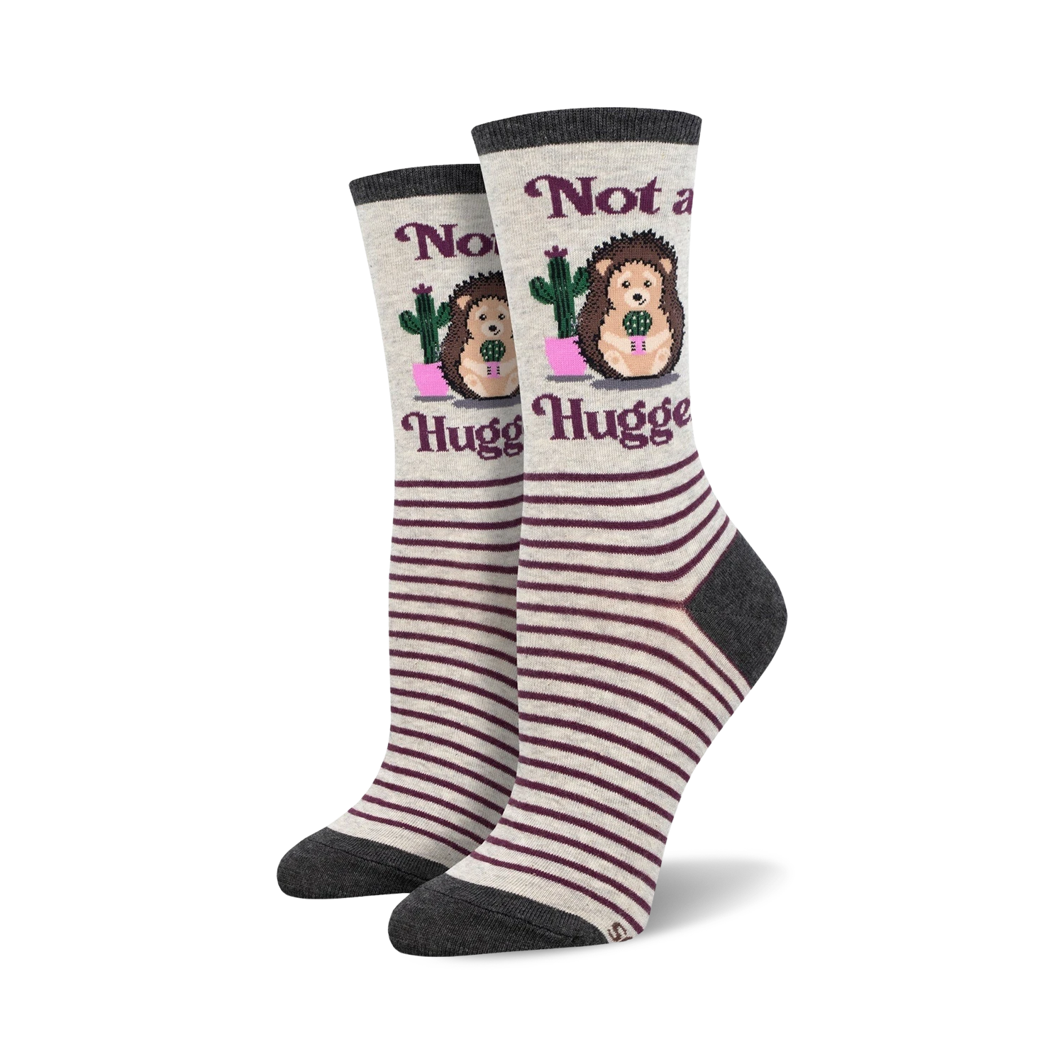 Calling all prickly fashionistas! Our Not a Hugger socks feature a porcupine lounging in a pink flower pot, holding a green cactus. With ‘Not A Hugger’ in bold purple letters, these gray socks with purple stripes are perfect for those who like to keep their personal space… personal! Show off your unique style and love for all things prickly with these crew socks made for women.