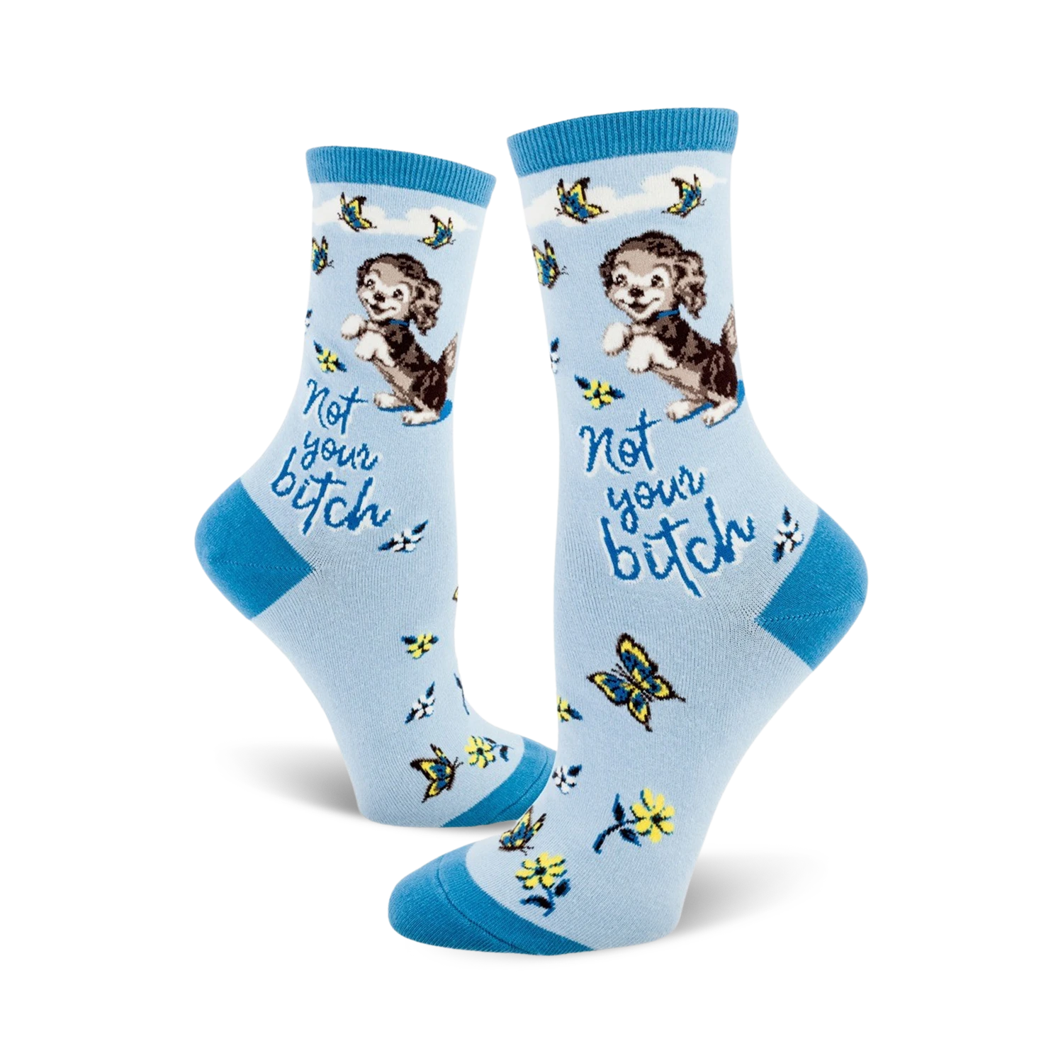Not Your Bitch Puppy Dog socks are like a walk in the park on a sunny day. Blue socks bloom with white and yellow flowers and yellow and orange butterflies while a brown and white cartoon pup on each foot reminds you that you’re your own best friend. Show off your independence with these vibrant novelty socks and strut your stuff ’cause these socks belong to you and you only.