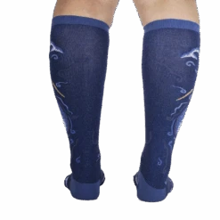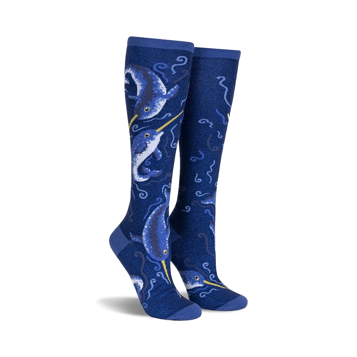 Get ready to plunge into a magical underwater adventure with our Once Upon a Narwhal Shimmer knee-high socks! These dark blue socks are adorned with a whimsical pattern of majestic narwhals with their enchanting spiral tusks and a touch of shimmer that’ll make you feel like you’re floating through a mystical sea. Dive into a world of wonder and let these narwhals guide you to new depths of style and imagination. Get ready to make a splash wherever you go!
