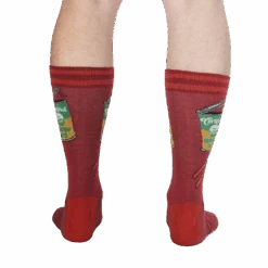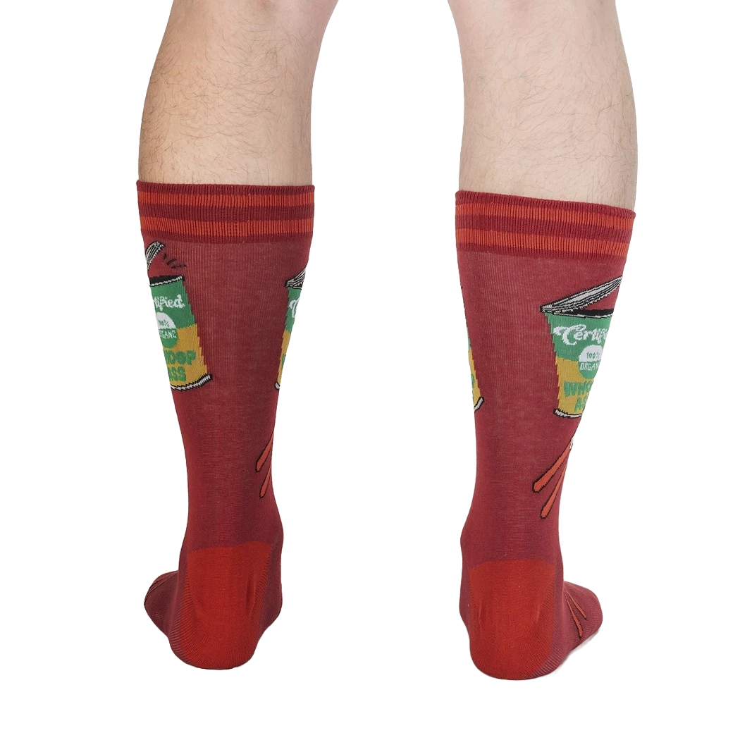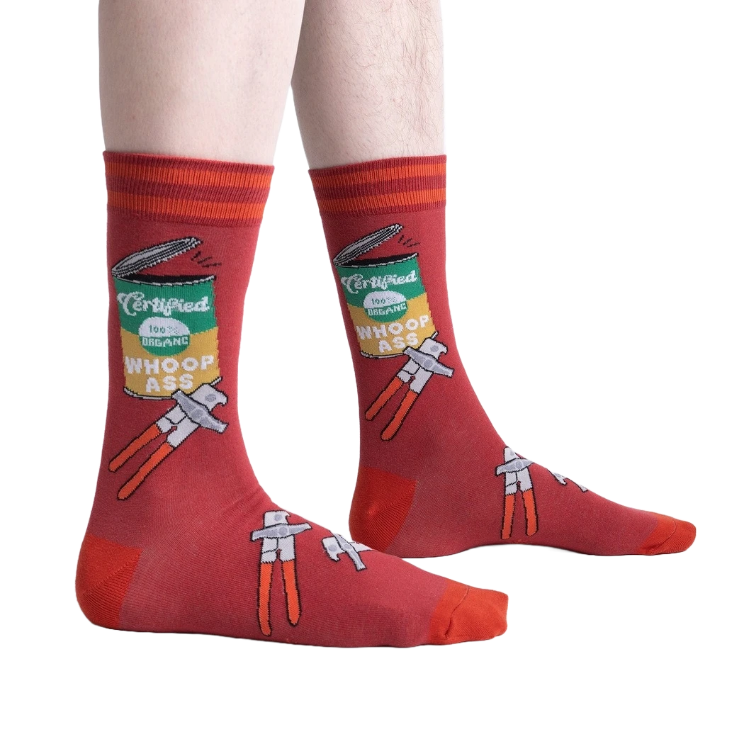 Ready to crack open a fresh can of whoop ass? These red crew socks with bright orange stripes at the top feature a can opener design on the front, prying open a can of Certified 100% Organic Whoop Ass. Wear these sassy socks the next time you need to show the world you mean business!
