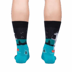 Buckle up for an Out of Boaty Experience with these exhilarating socks! Picture this: a groovy blue canvas adorned with a person on a boat, abducted by curious aliens in a sleek spaceship. Their legs flail, adding a touch of hilarious drama. Embrace the unknown and let these socks abduct your style to infinity and beyond.