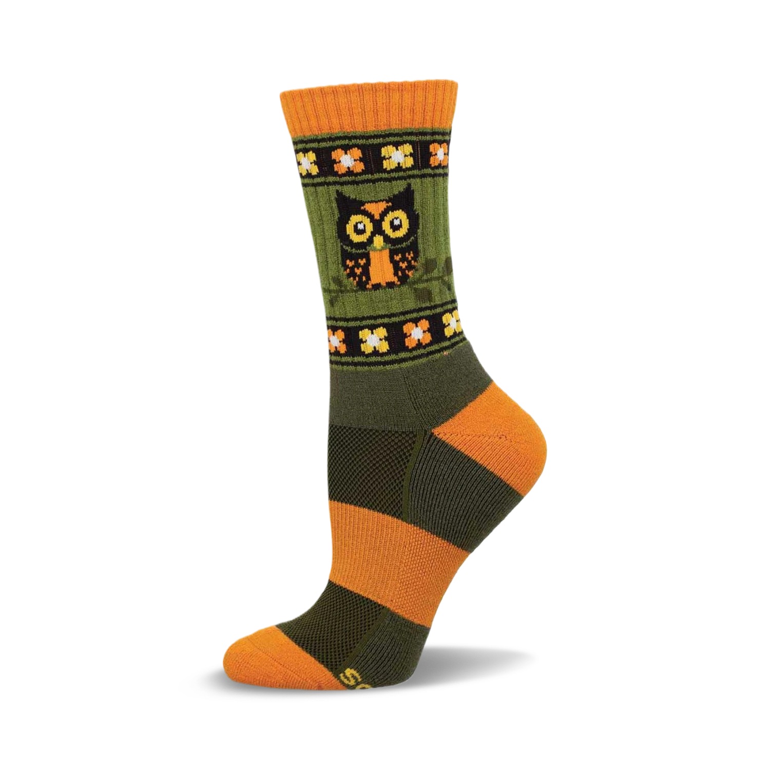 You’d never know by just looking at them, but owls are the ultimate silent hunters, thanks to their specialized feathers that muffle the sound of their flight. They can also rotate their heads up to 270 degrees, giving them a 360-degree view of their surroundings. Who knew these wise birds had such stealthy moves? With these green and orange striped socks adorned with an owl and a small white flower near the top, you’ll glide through every adventure in unmatched comfort. Equipped with a super-soft Merino wool blend, cushioned footbeds, and arch support, these socks are perfect for your first visit to socksmith.com. Enjoy 20% off your first order on us!