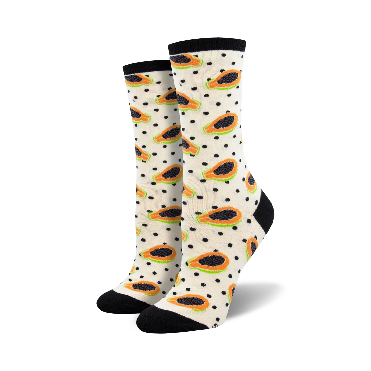 The fruity Papaya Pin Dot Socks are sure to be a ‘peel’ing success because they have a fun white and black polka dot pattern set against the orange and green of papaya fruit. What does it mean? Well, these women’s crew socks mean you can wear something fruity and have fun while expressing your lively and vibrant style!