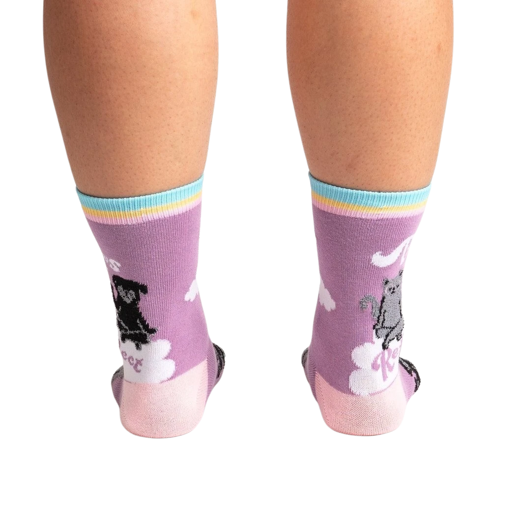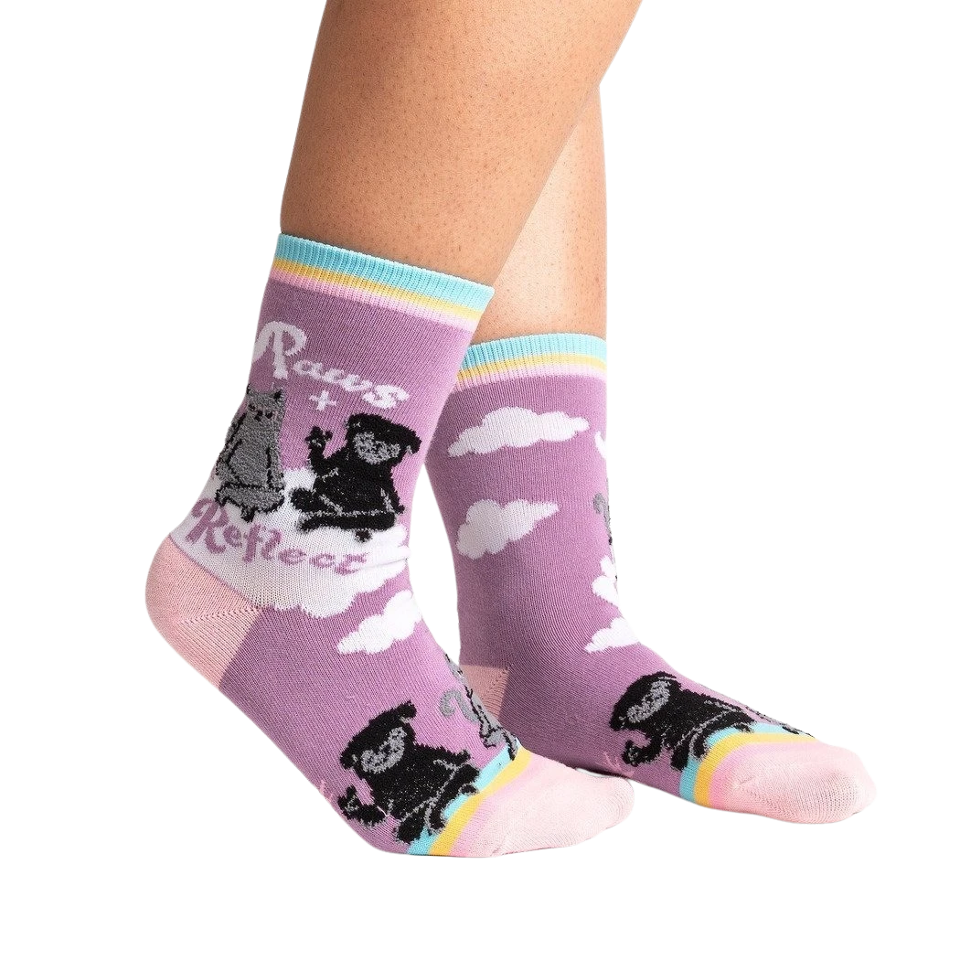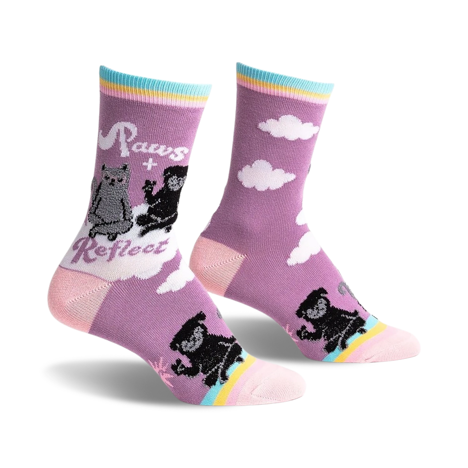 Paws + Reflect socks: Mew-ve over boring socks! These crew socks feature two adorable kitties sitting back-to-back, surrounded by a rainbow, clouds, and the words “Paws + Reflect.” They’re purr-fect for anyone who loves cats and fun socks. Plus, a portion of the proceeds from each sale goes to help cats in need. Get ready to show off your paws-itive style!