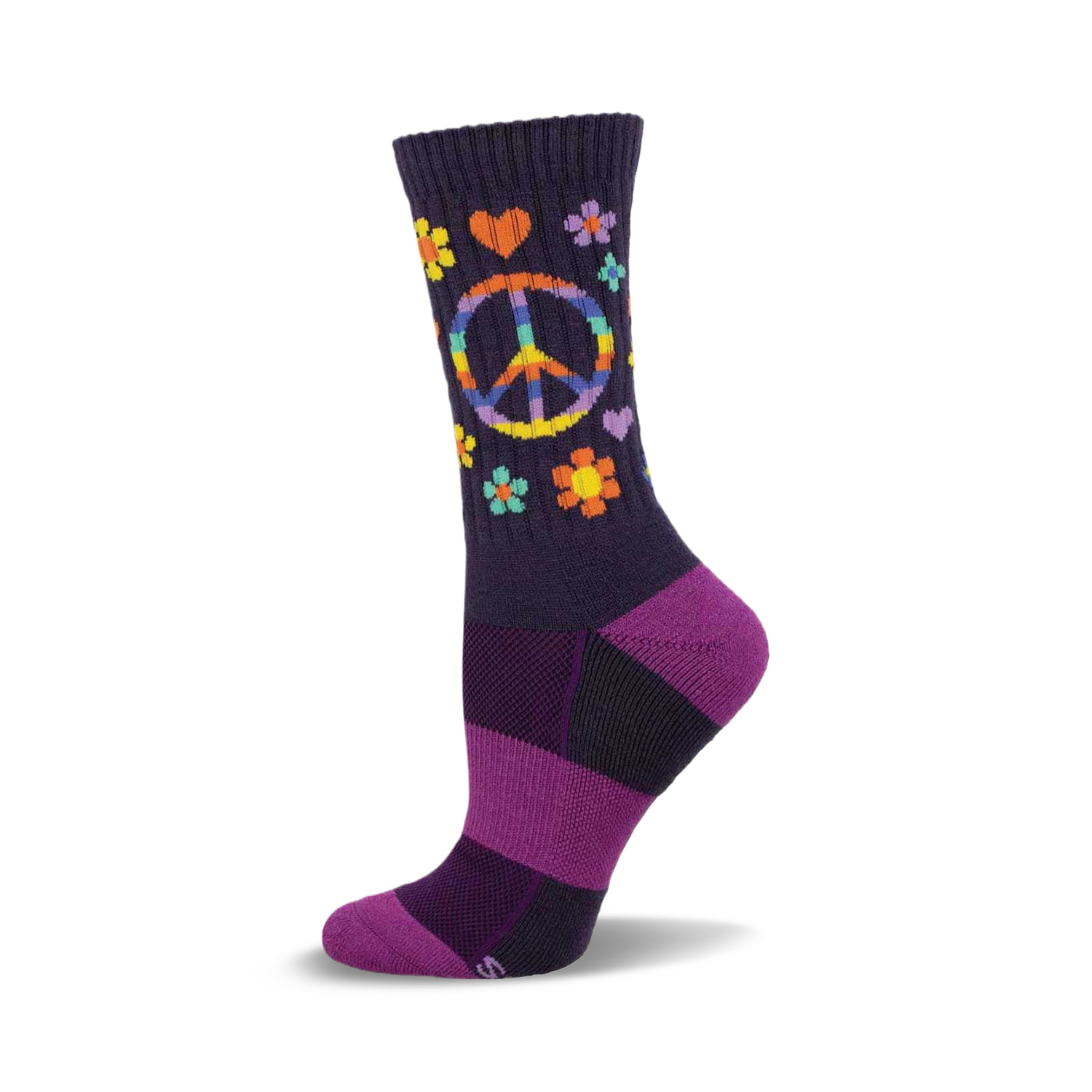 Peace and tranquility have never looked so stylish. Our Merino wool socks embrace the spirit of serenity with a charming design featuring peace signs and flowers. Perfect for nature enthusiasts and comfort seekers alike, these socks bring a touch of whimsy to any adventure. Let every step feel like a gentle breeze through the trees, with breathable mesh panels and dynamic arch support ensuring your feet are as happy as you are.