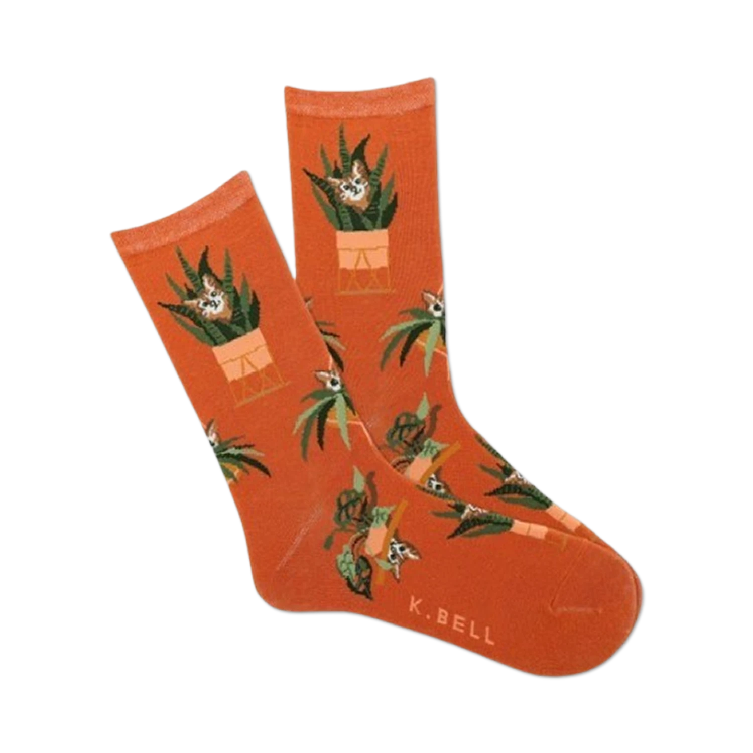 Peeking Cat Socks: Meet our playful felines! These crew-length socks made for women feature a captivating pattern of potted plants with adorable gray and white cats peeking out. The vibrant orange backdrop and lush green plants create a whimsical touch that’ll brighten up your day. These socks aren’t just eye-catching but ultra comfy too, perfect for cat enthusiasts and anyone who loves a pop of fun in their sock drawer.