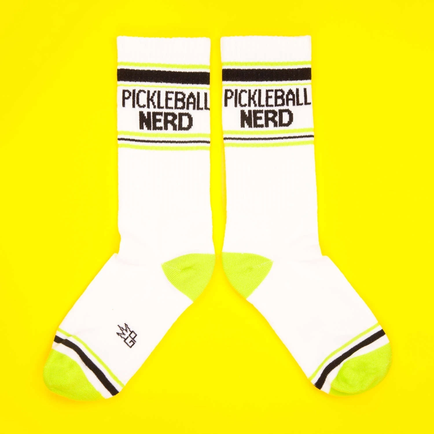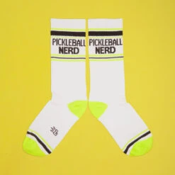 Some say pickleball is a sport; others call it an obsession. Either way, these “Pickleball Nerd” socks are a tribute to the game that’s captured hearts across the nation. Crafted with Bleach White Cotton and accented with Lime and Black Nylon, they offer a stylish nod to your favorite pastime. Whether you’re smashing it on the court or lounging at home, these unisex, one-size-fits-most socks have you covered with comfort and flair. Made in the USA, theyre perfect for those who play with passion and live with pickleball pride.