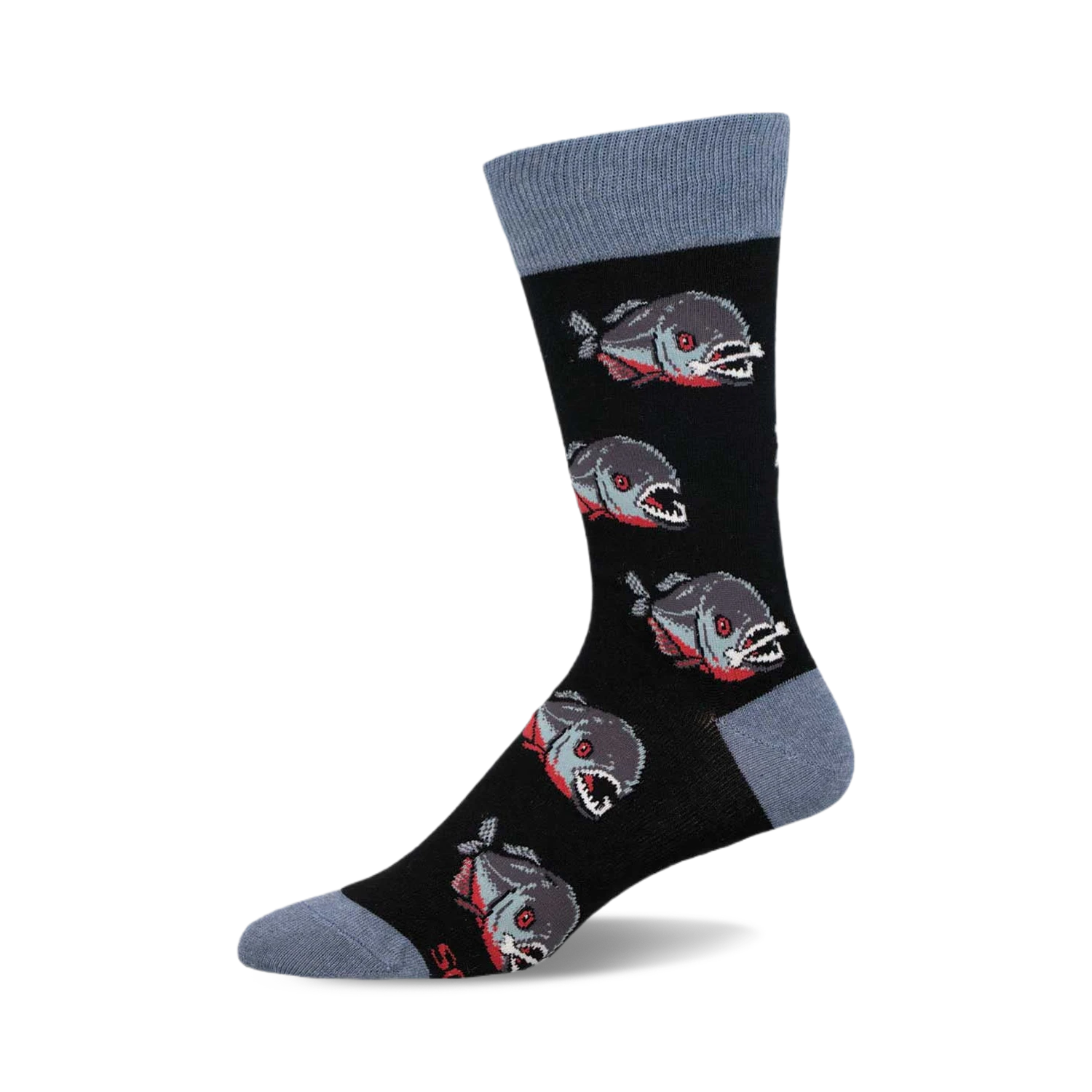 Theres something about the mystery of murky waters that keeps us on our toes. But why risk it when you can flaunt a pair of socks that brings the thrill to your feet? These black socks with a snazzy blue cuff are adorned with a fierce pattern of grey and red fish sporting some seriously sharp teeth. Perfect for anyone who likes their style with a side of adventure.