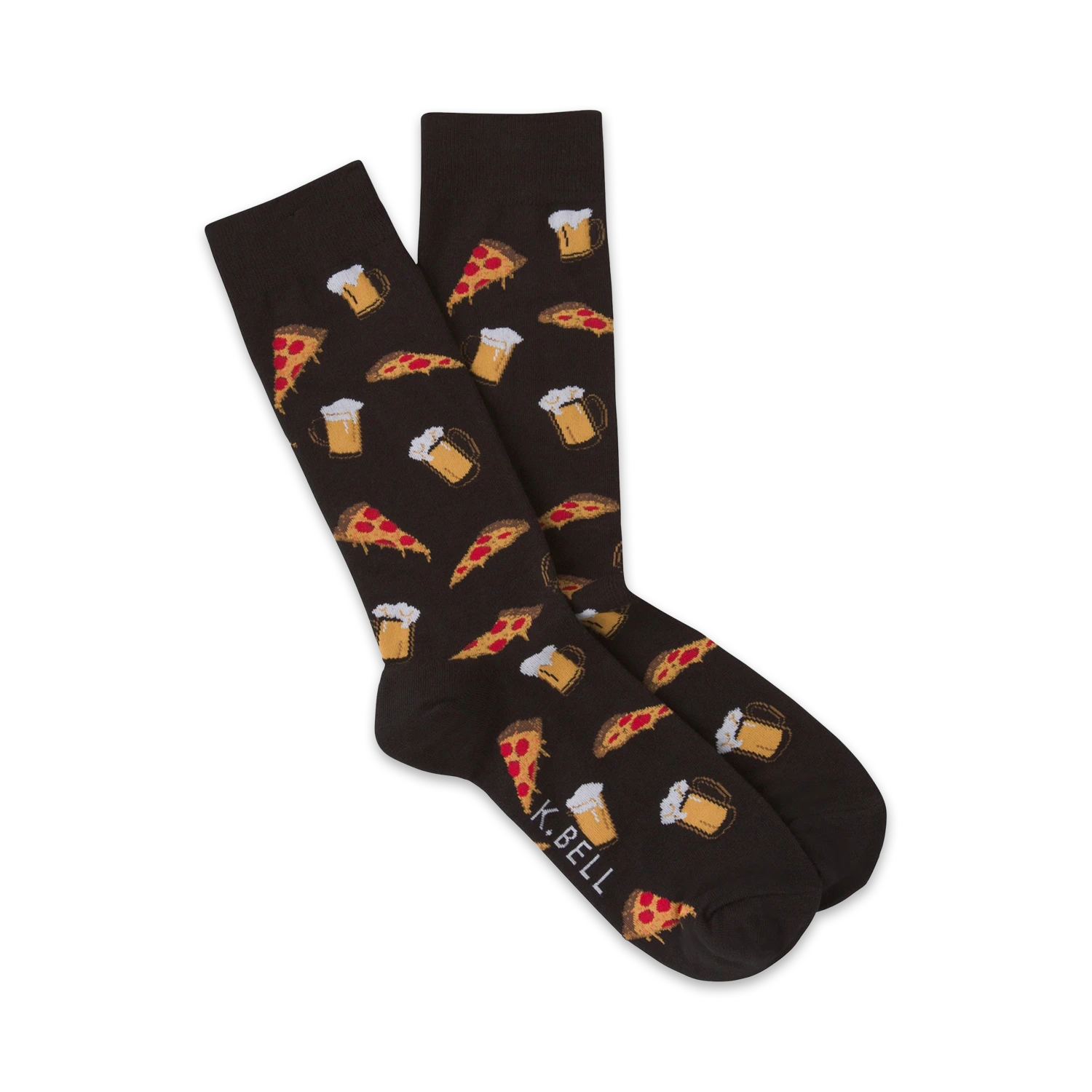 Pass me a slice and top me up. Nothing quite beats this appetizing combination when it comes to a late supper! This pair of all black crew socks features a pattern of floating slices of pizza and beer mugs. You’ll be asking for seconds, and thirds, and probably fourths! Bottoms up!