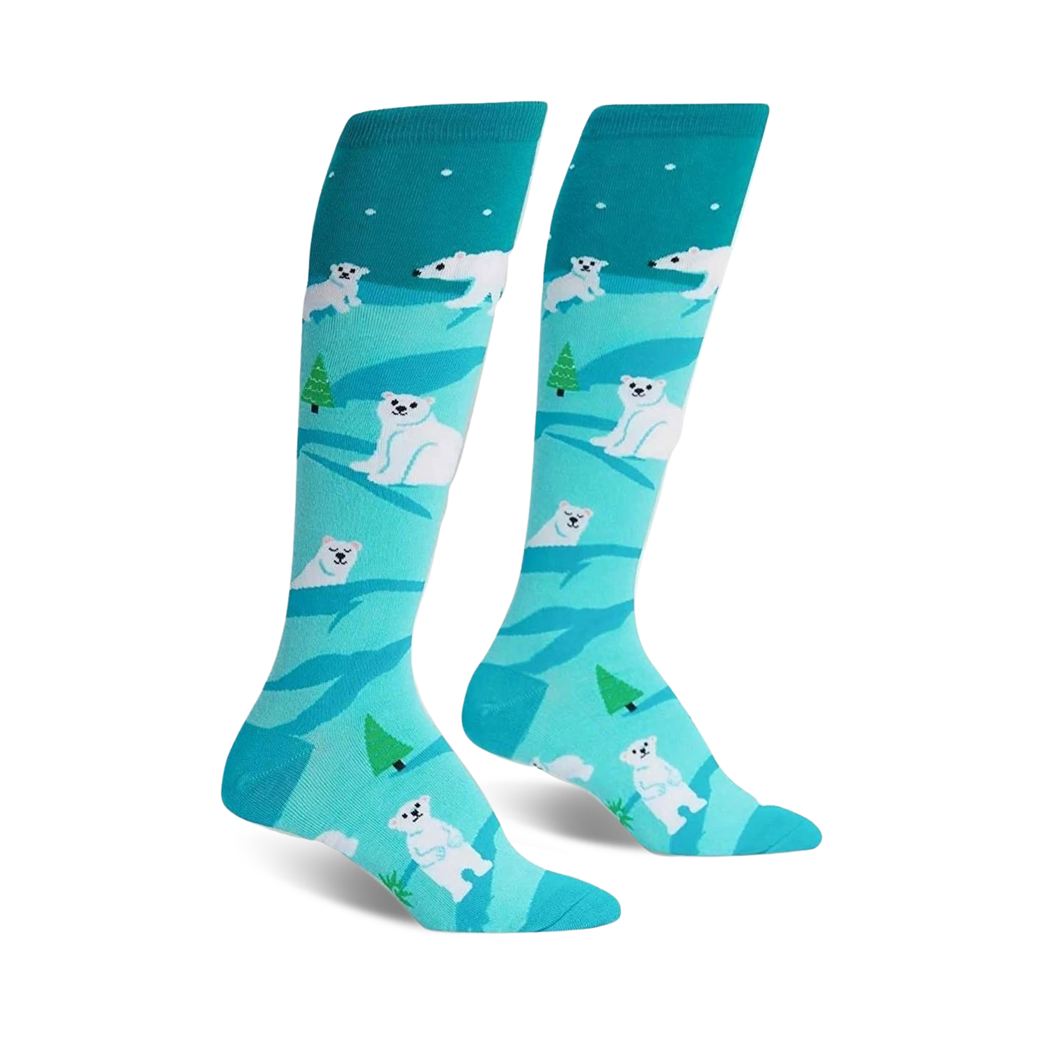 Put on your Polar Bear Stare Knee High socks! With cute white polar bears flaunting their fashionable furs amongst the cool blue evergreen trees and delicate snowflakes, there’s no denying the arctic vibes you’ll be serving. Be the envy of the animal kingdom as you strut your stuff all winter long. These polar bear socks aren’t just cute, they’re like a warm, fuzzy hug for your feet.