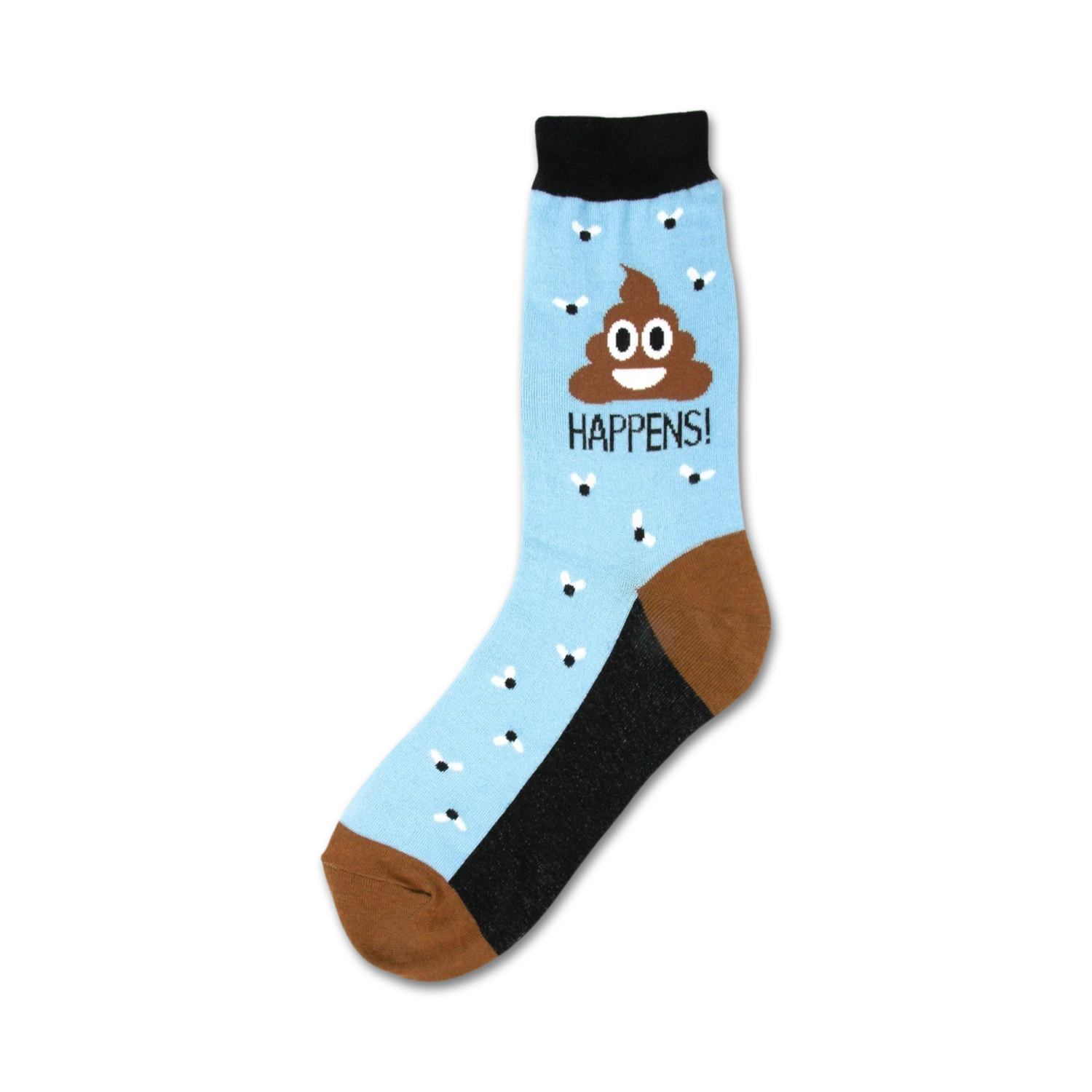 Poop Happens: Crew socks for women featuring a brown smiling poop emoji with the text “It happens!” and black flies buzzing around. These silly socks are made to remind you that even the stinkiest situations can be funny.