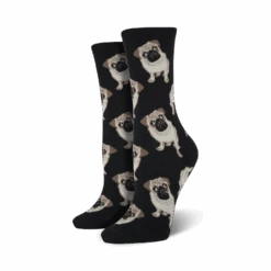 These pink crew socks feature a pattern of cartoon pugs in bright colors. The perfect conversation starter, this pair of socks is sure to bring a smile to your face and the faces of those around you! Did you know that pugs, with their wrinkly faces and compact bodies, are known to be playful and affectionate companions?