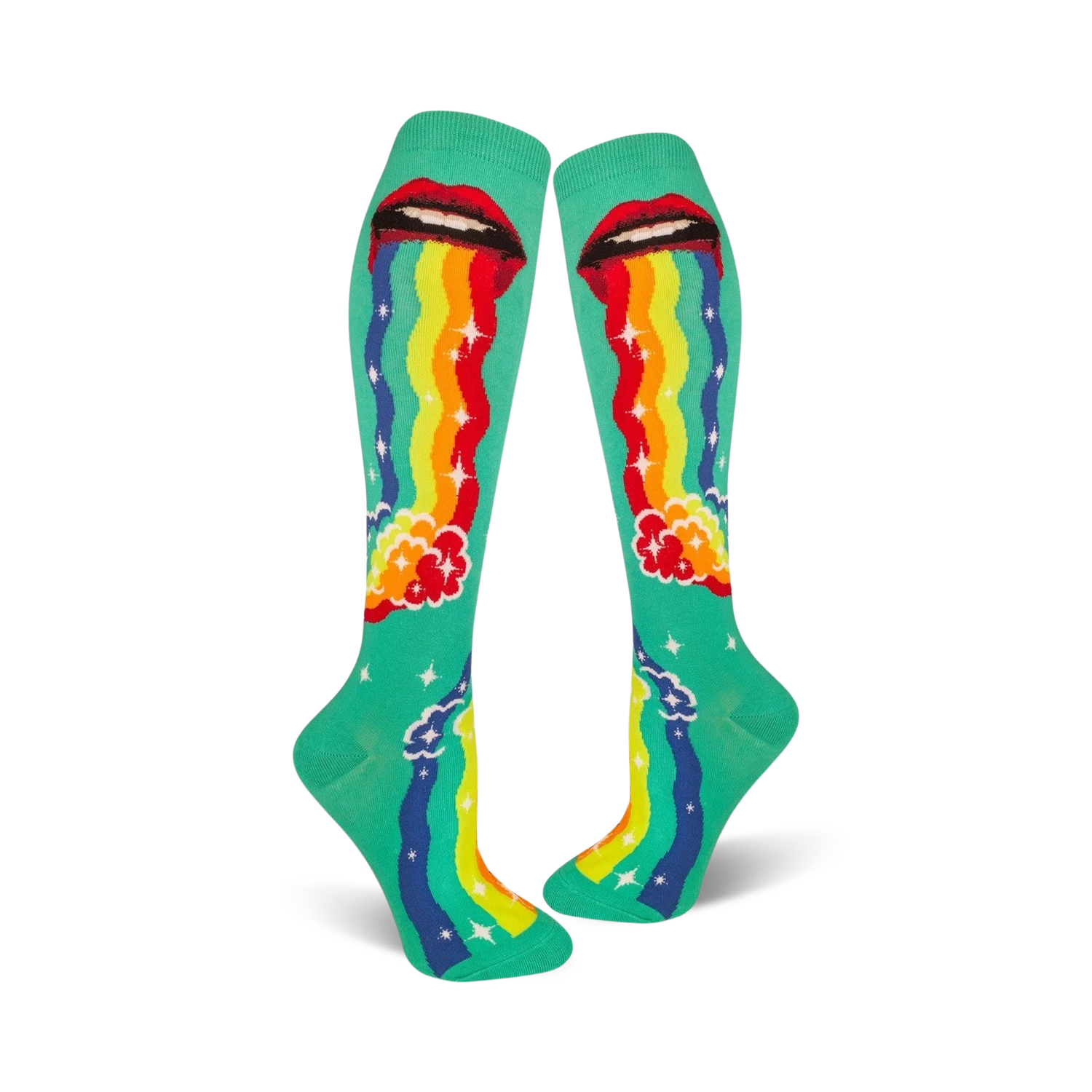 Puking Rainbows Socks: Kick your fashion up a notch with our knee-high socks adorned with red lips spewing colorful rainbows. Perfect for expressing your vibrant personality, these socks will have you walking on sunshine and making a bold statement wherever you go. Put on a pair of these happy socks and let the rainbow puke its way into your heart!
