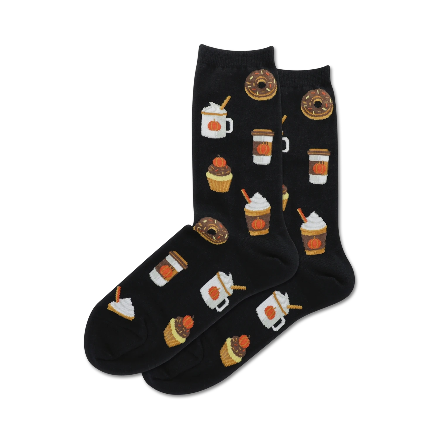 Pumpkin Spice socks, the perfect blend of everything Fall! With pumpkins, cupcakes, coffee cups, and donuts on a black background, these socks will make you feel like you’re walking into your favorite coffee shop on a crisp autumn morning. Warning: May cause cravings for baked goods.