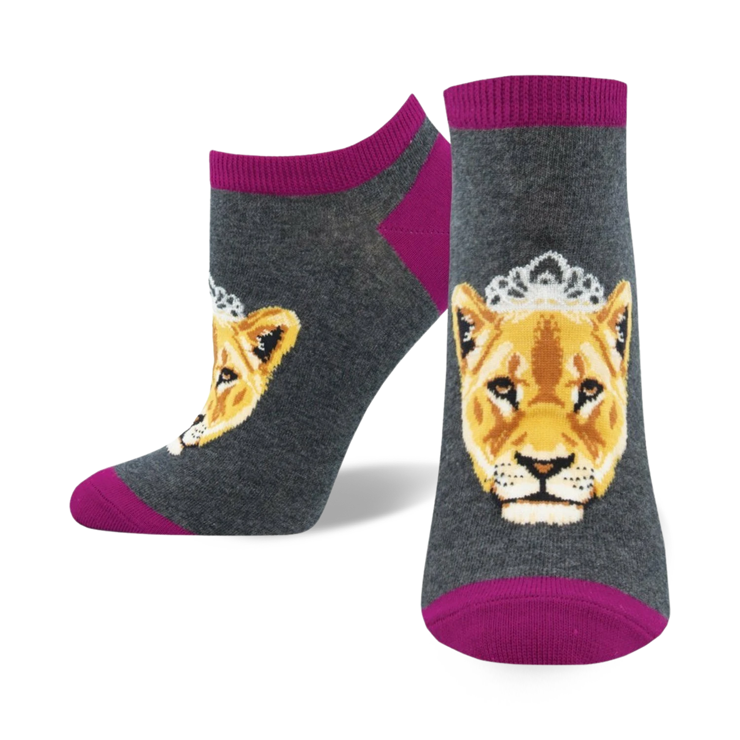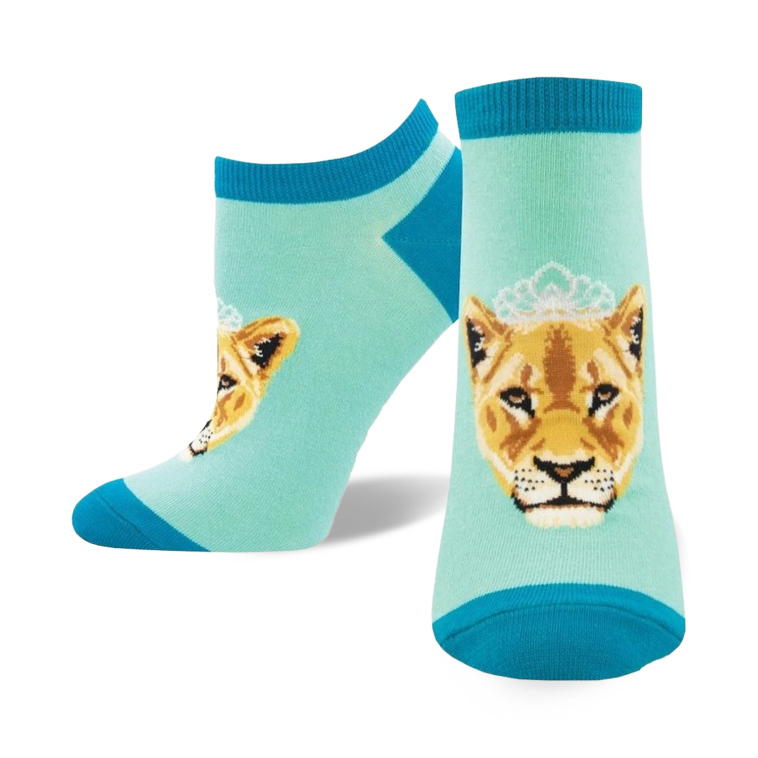 She’s the queen of the jungle, the ruler of the pride, and now she’s on your feet! These light blue ankle socks feature a pattern of cartoon lioness faces with golden fur, black noses, and blue eyes. They’re also wearing golden crowns, because they’re royalty, duh! These socks are perfect for any woman who wants to add a little fun and personality to her wardrobe.