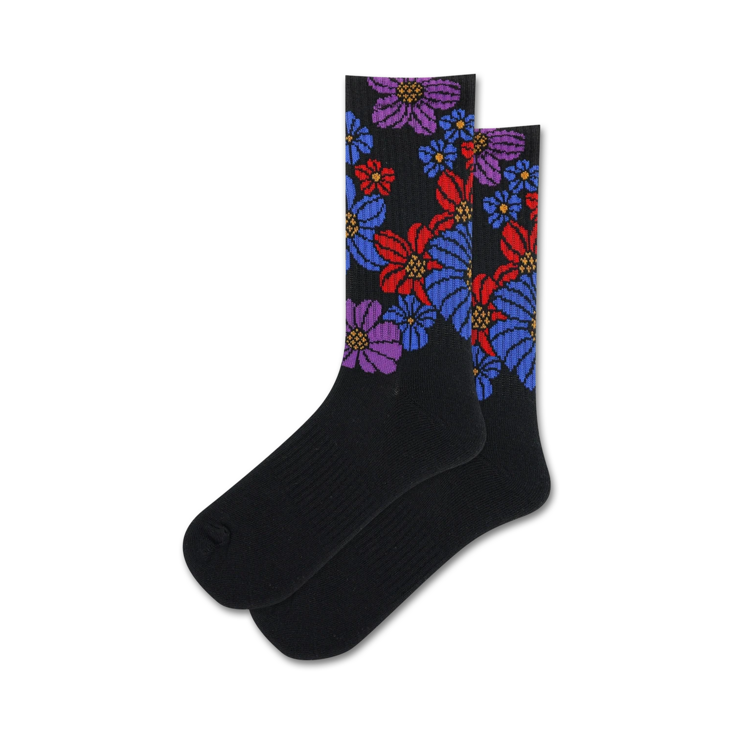 Groovy garbs for groovy gals! Our Retro Flower Crew Socks bring the fun and funk of the 60s & 70s right to your feet. With a bright and colorful floral pattern popping against a bold black background, these socks are sure to turn heads wherever you go. Slip into a pair of these beauties and let your feet bloom with flower power!