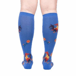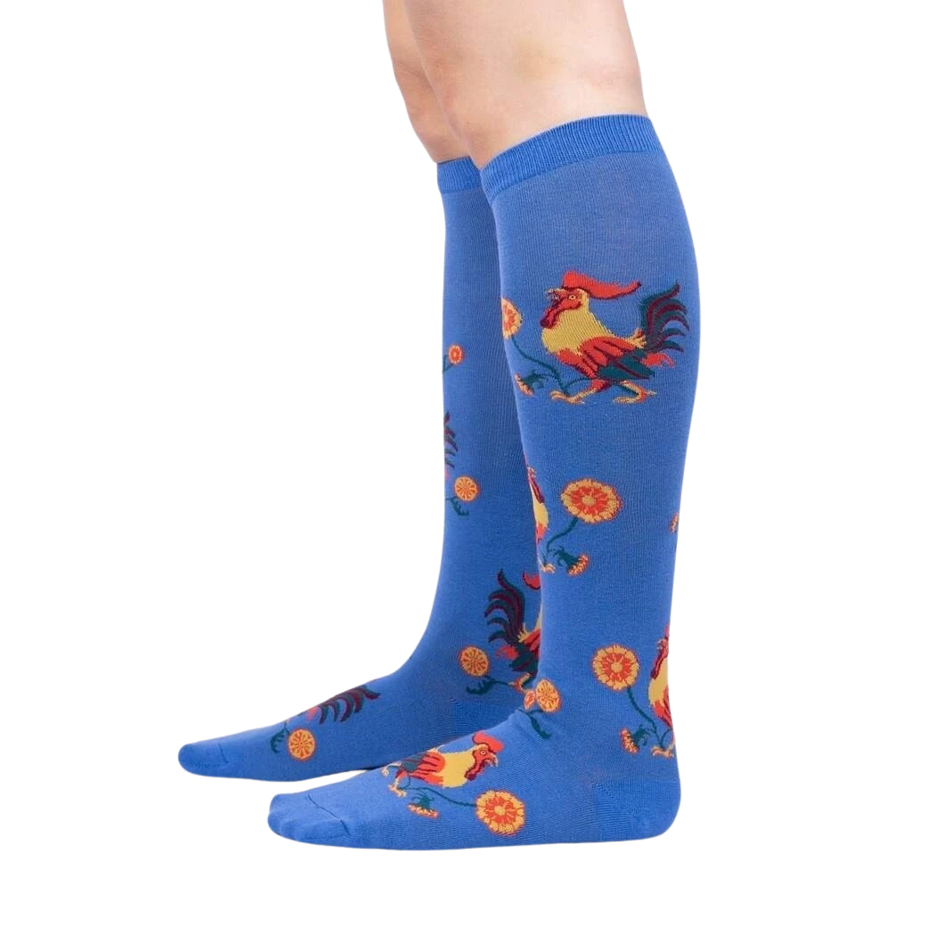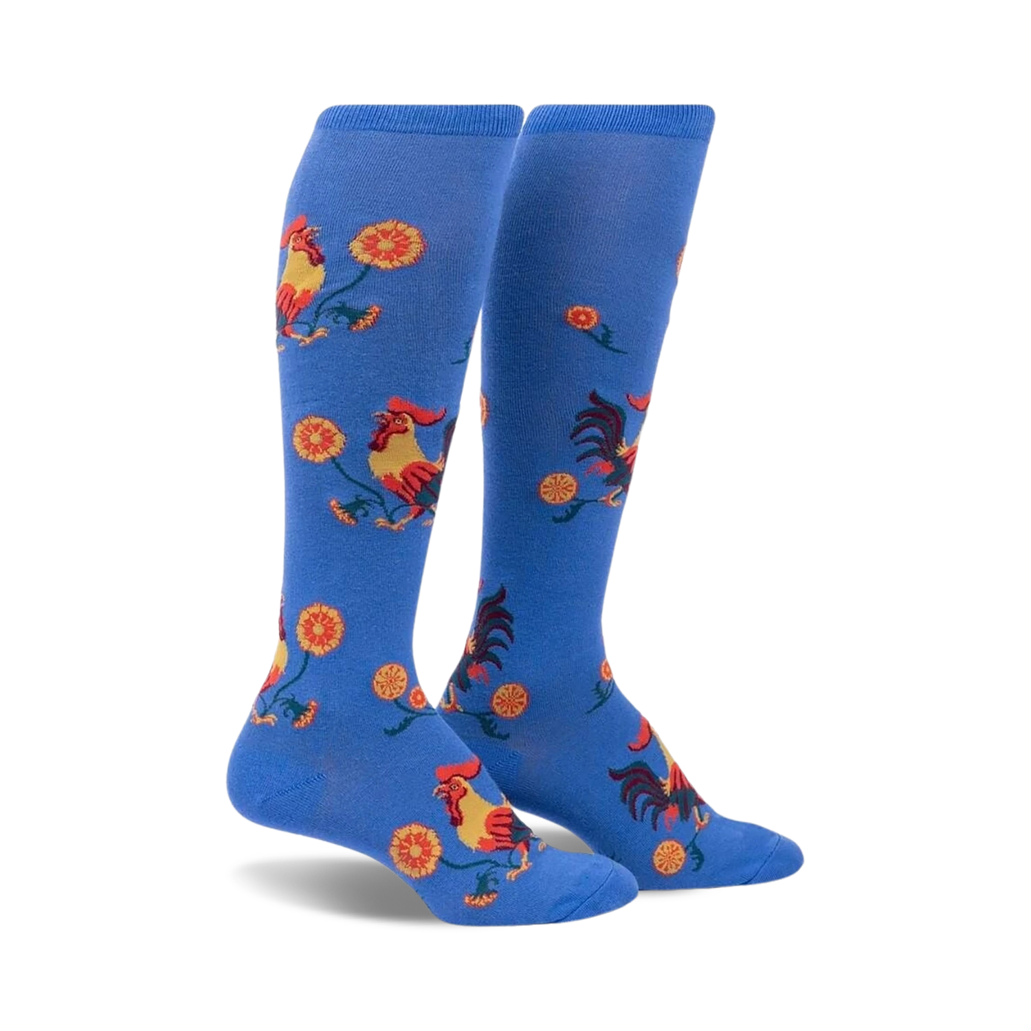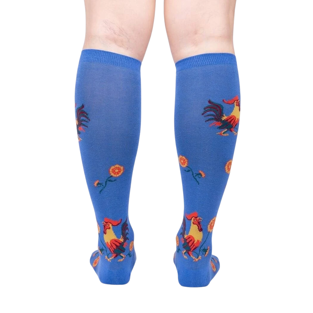 Kickstart your day with a smile and strut your stuff in these Rise and Shine socks! Featuring a cheerful pattern of red and orange roosters strutting in front of vibrant yellow sunflowers against a crisp blue backdrop, these knee-high socks for women will add a touch of fun and energy to your everyday style. Perfect for the office, a casual day out, or even a night on the town. Let these rooster socks be your daily reminder to rise and shine, no matter what the day brings.