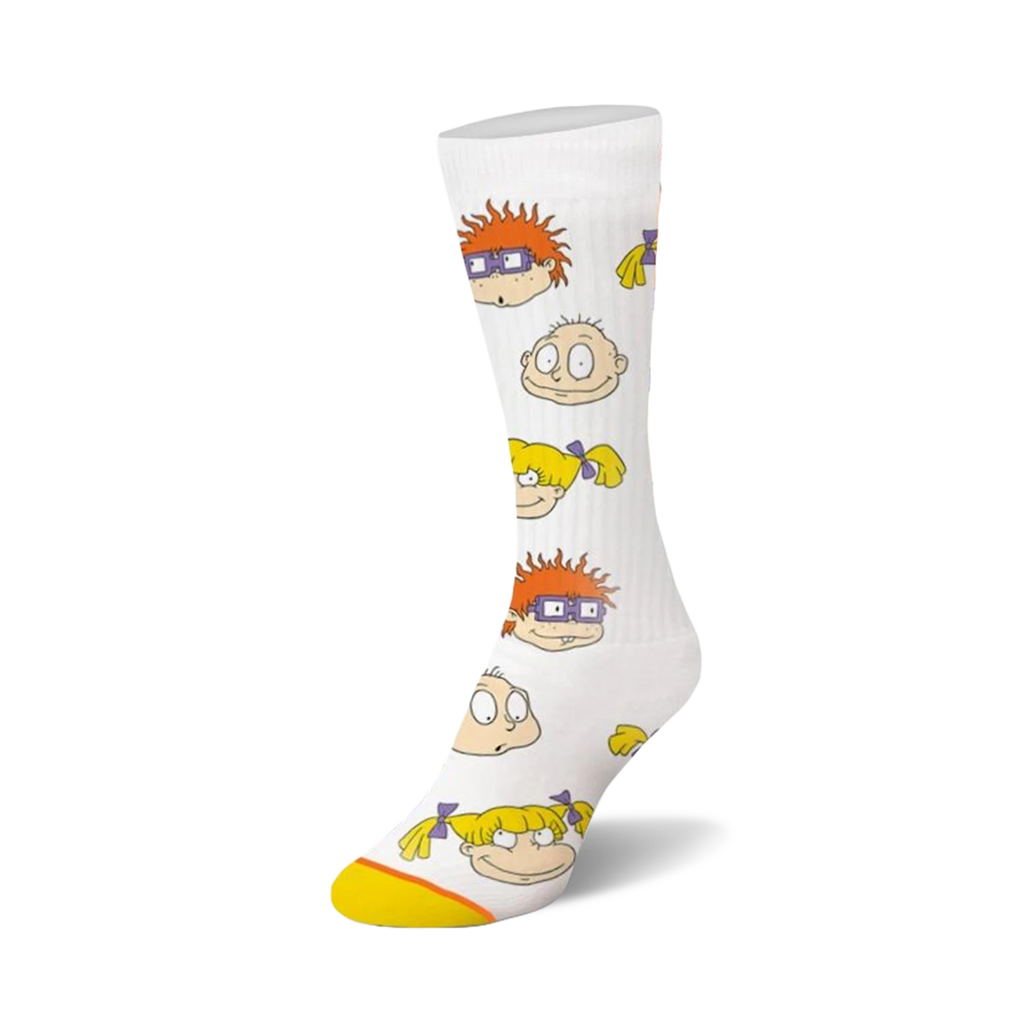 Who says socks have to be boring? Put on a pair of these white Rugrats Squad socks featuring the faces of Tommy, Chuckie, Angelica, and the whole Rugrats crew and get ready to laugh, reminisce, and let your inner child run wild. These crew-length socks are made to make you smile and are perfect for any Rugrats fan. Rock these socks and show your love for the classic cartoon!