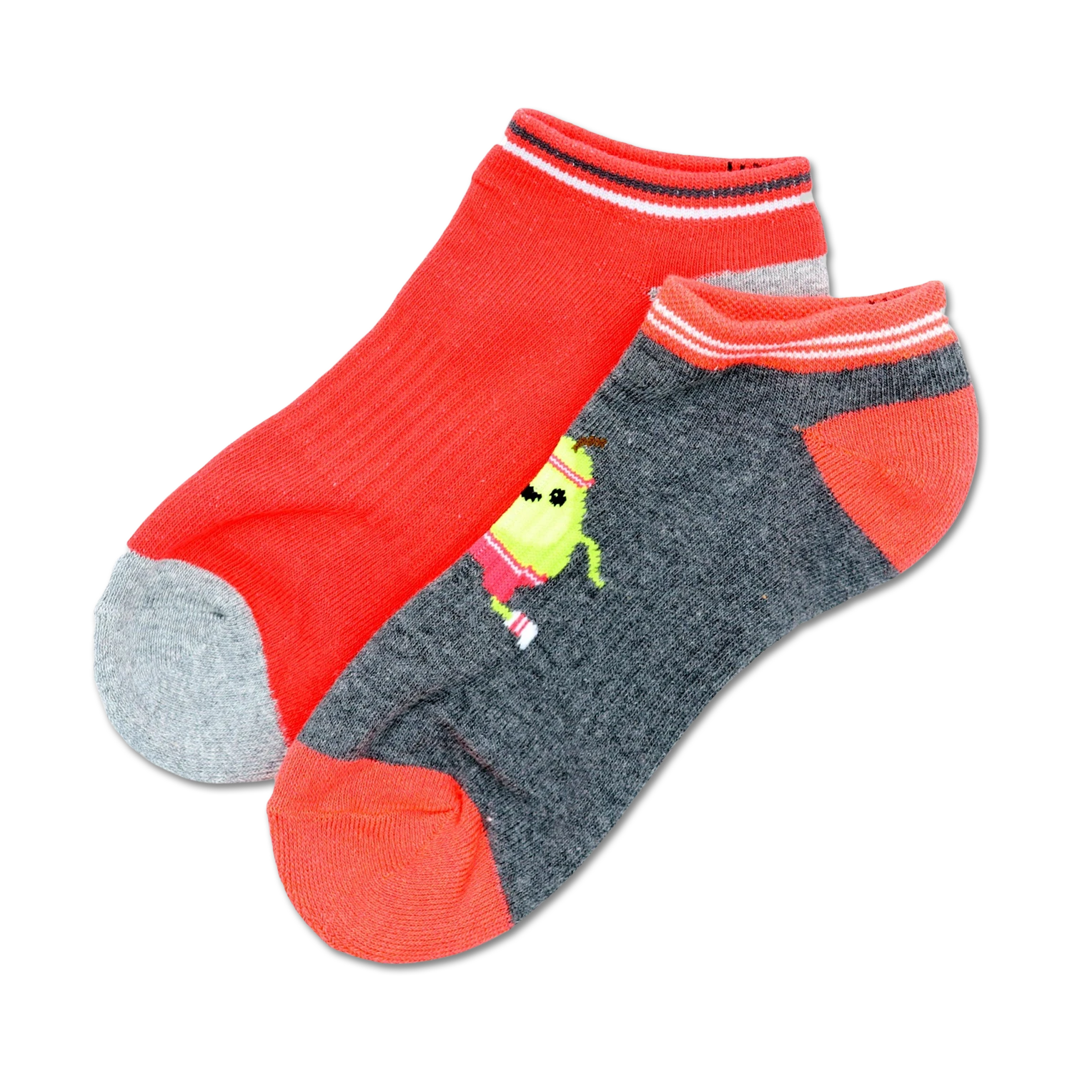 Got low-cut socks? Pear-fect! Our Running Pear 2 Pack delivers a dose of fruity fun. Perfect for a casual outing or a day spent running errands, these socks will keep you feeling and looking fresh. Featuring a green pear with a cheeky smile, red headband, and gray sneakers, these socks will make you want to put your best foot forward.