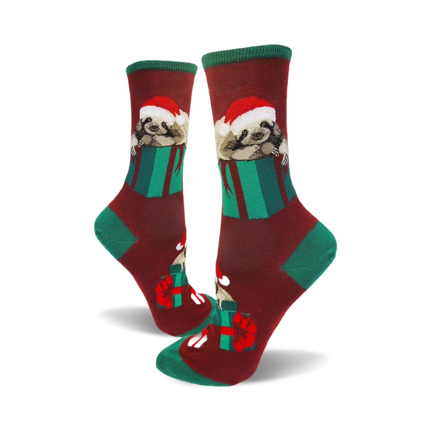 Santa’s secret to a stress-free holiday might just be taking a cue from these sloth-inspired socks. As he dozes off under the tree, wrapped in a cozy Christmas vibe, these crimson crew socks with adorable sloths in Santa hats bring a delightful touch of whimsy to your yuletide celebrations. Perfect for anyone who prefers to savor the season at a leisurely pace.